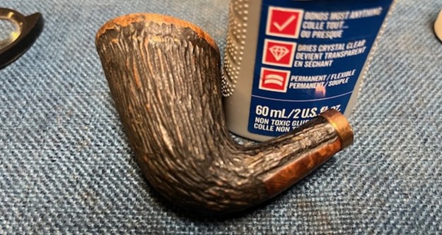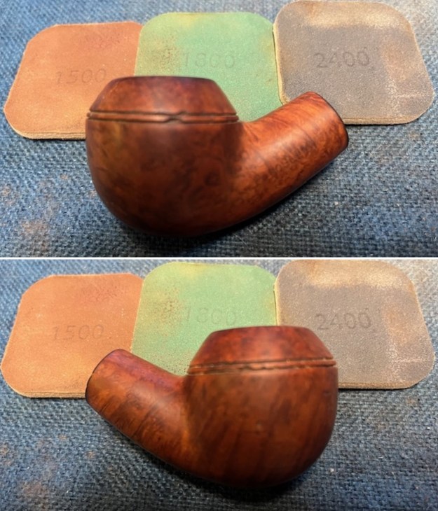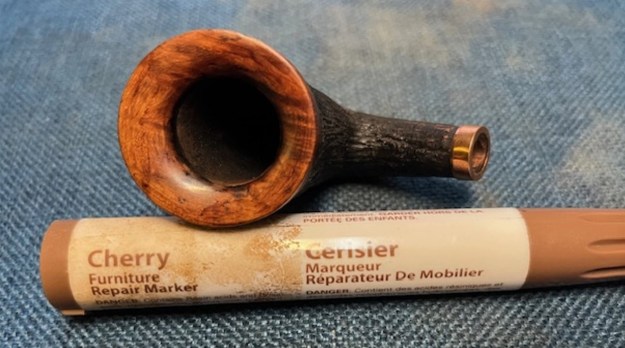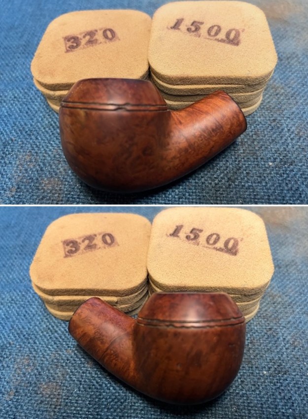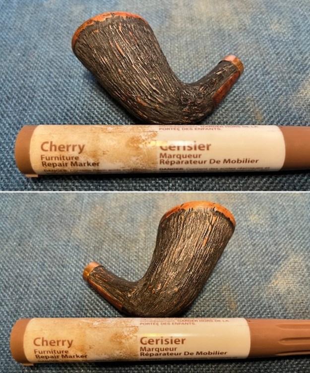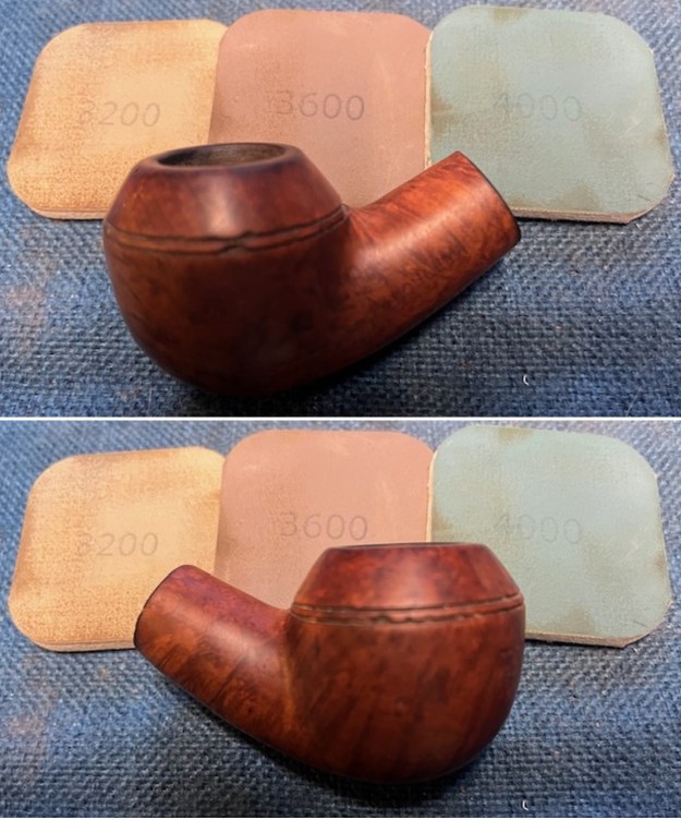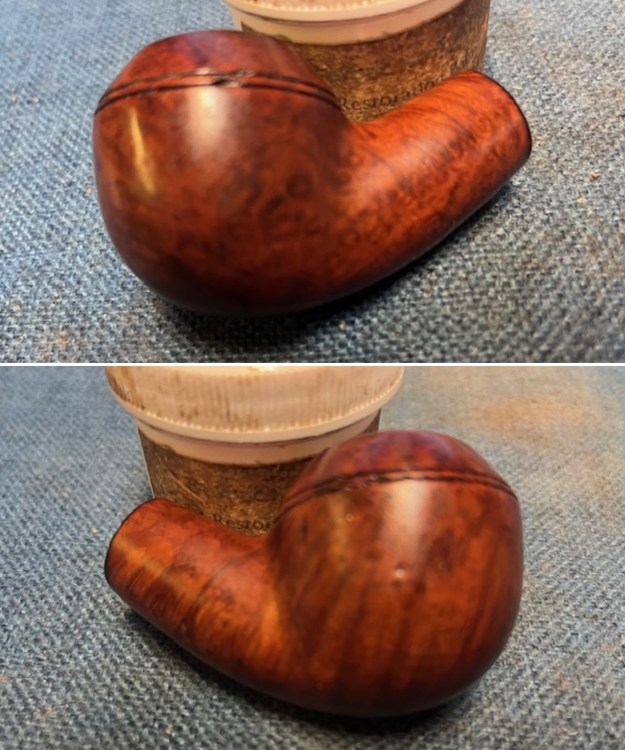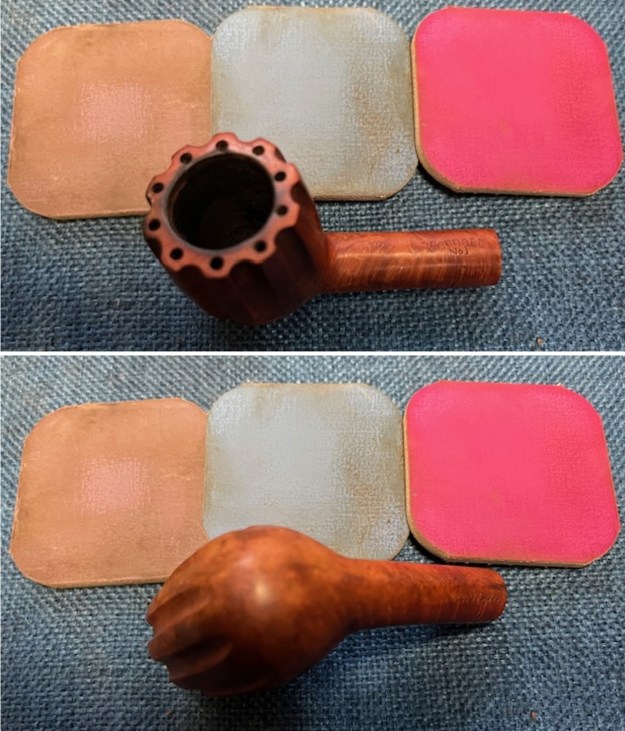 I cleaned the rim top with Before & After Briar Cleaner to soften the dark spots and darkening on the rim top. I used a brass bristle wire brush with the product deep clean the grooves in the double rusticated rim top.