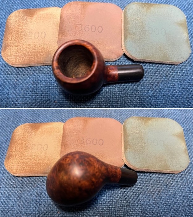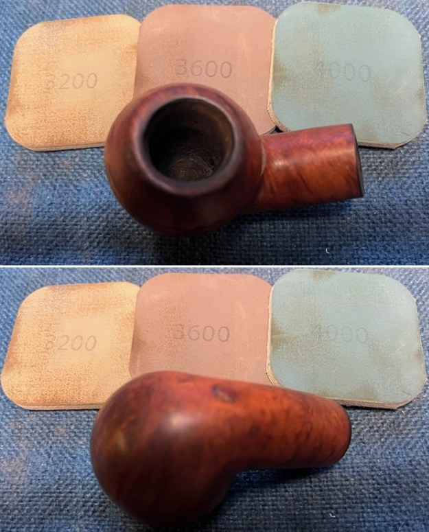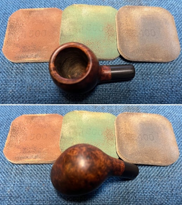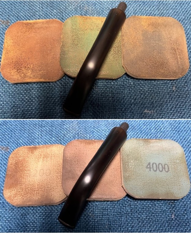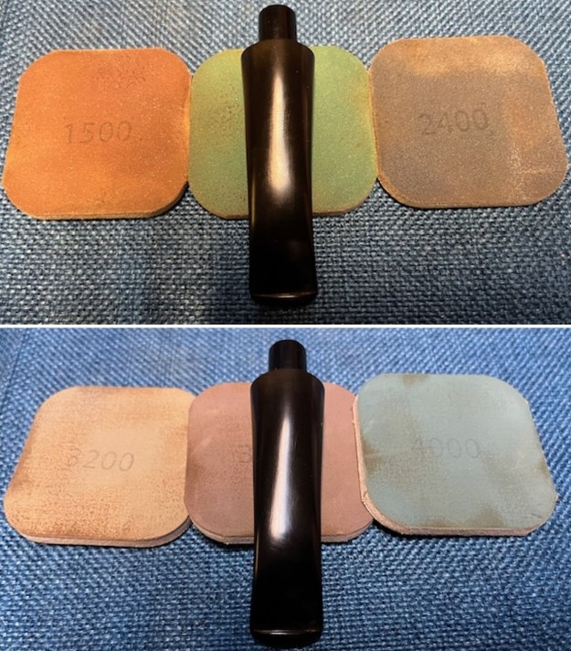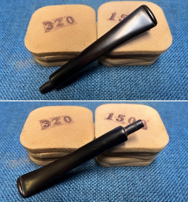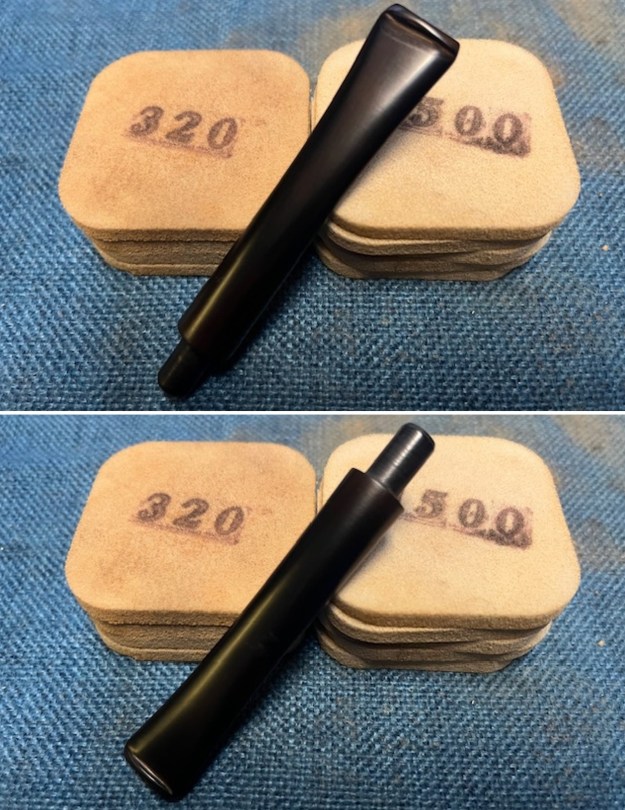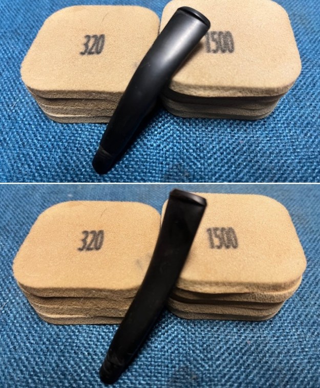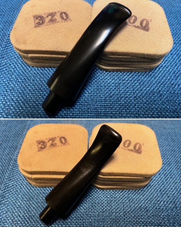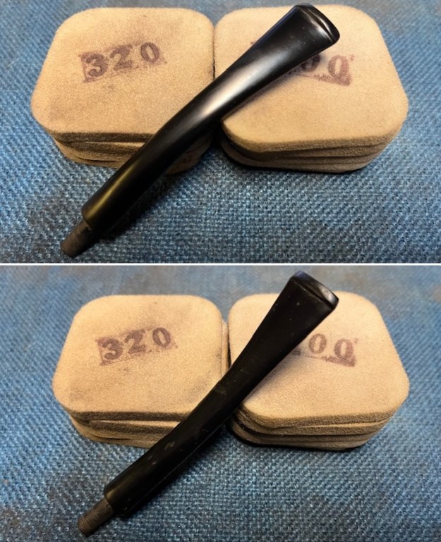 I finished working on the stem by sanding it with 32-3500 grit 2×2 inch sanding pads to smooth out the repair and to remove the tooth chatter. The pipe stem was looking very good.