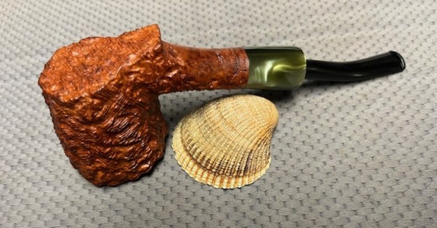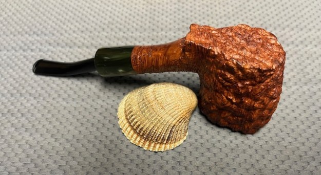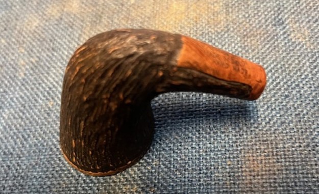 The next pipe on the table was purchased from a seller 05/28/24 from Santa Cruz, California, USA. It has that verve that I have come to associate with pipe made by Preben Holm and the fellow we purchased this lot from obviously loved Preben Holm carved pipes because we acquired several from him in this lot. They are unique and beautiful. The pipe is stamped on a smooth panel on the underside. It reads Monte Verde [over] Made in Denmark [over] by Hand [over] Golden Tan. The shank extension is a marbled green acrylic shank extension has a gold Crown MV on the top. I have refurbished several Monte Verde pipe so if you are interested in the brand here is a link to one I did back in 2019 that has a similar finish to this one (https://rebornpipes.com/2019/02/09/new-life-for-a-preben-holm-monte-verde-twin-finish-freehand/). It was quite dirty, like the rest of the pipes in this collection. There was a thick cake in the bowl and a lava overflow on the rusticated rim top. The inner and outer edges of the bowl looked very good. The stem was present for these photos but somehow disappeared in its journey from Jeff to me. Jeff took photos of the pipe before he started his cleanup process.