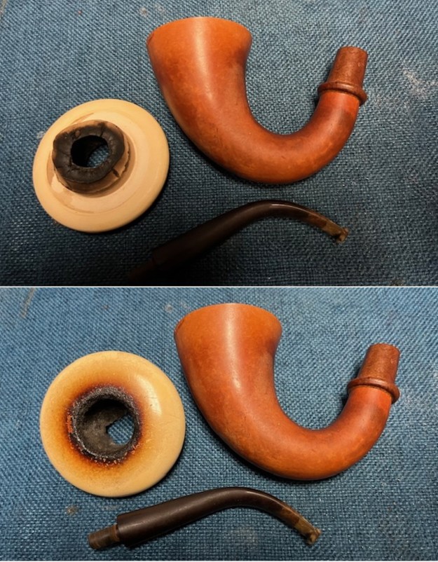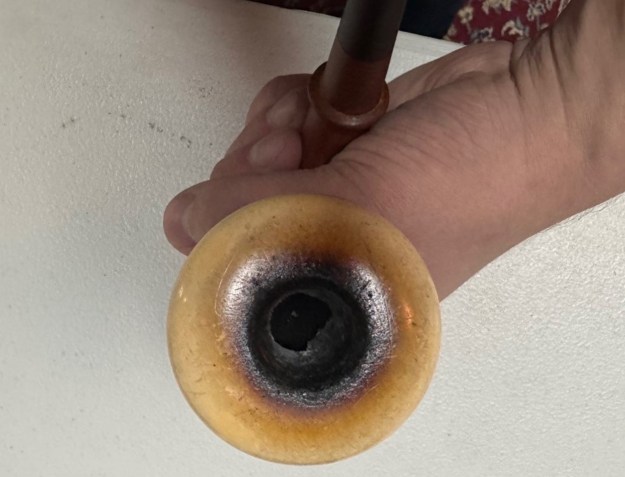 He took close up photos of the bowl and rim top from different angles to show the condition of the rim top. The bowl has a thick cake that lining the walls and overflowing lava and build up on the rim top and flowing over the inner edge of the bowl onto the top. It is hard to know if there is damage or if the lava protected it. He also took photos of the stem to show the surface of the top and underside of the acrylic stem. You can see the tooth marks and chatter on both sides ahead of the button. I only wished that the stem had travelled to me here.