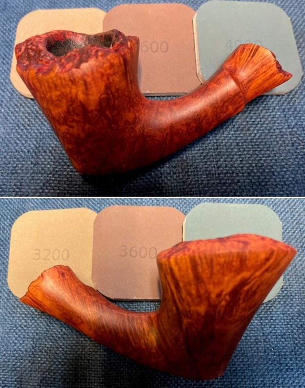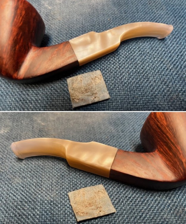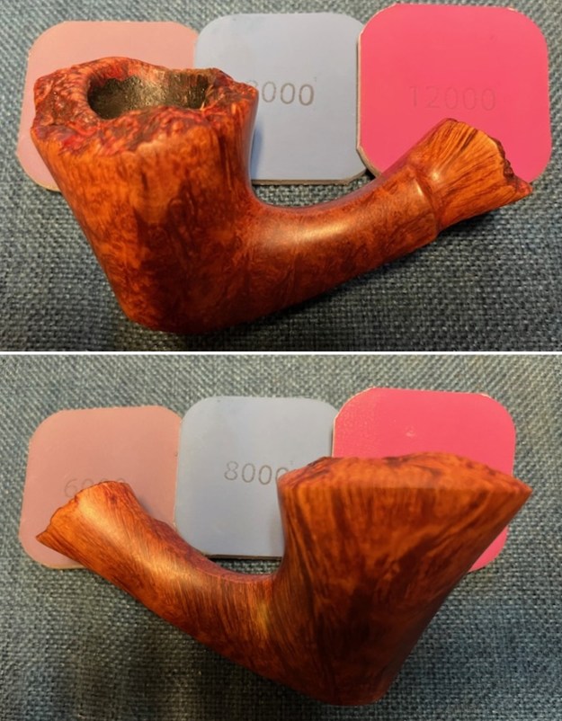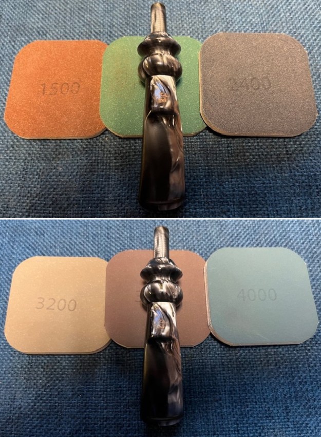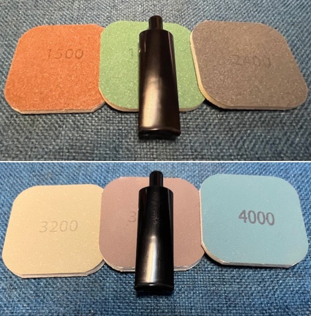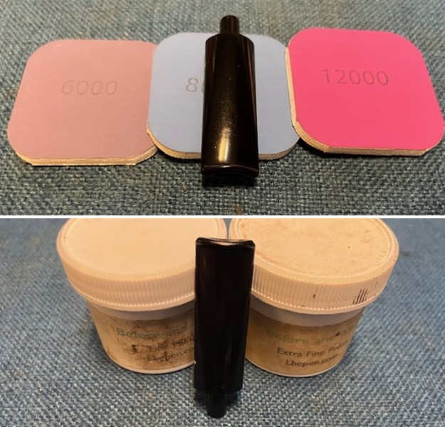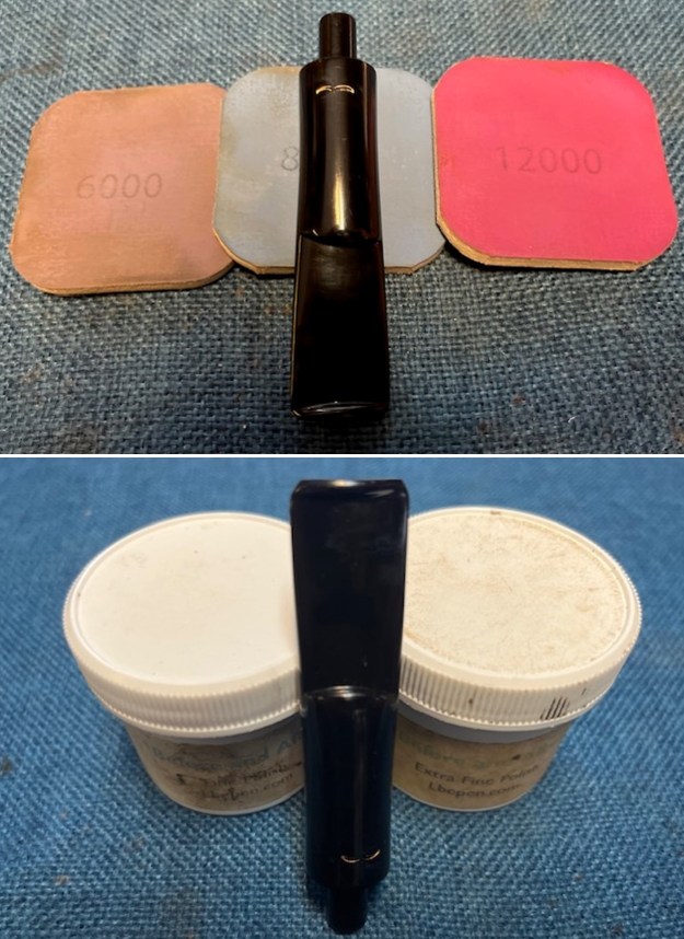 I polished the vulcanite with micromesh sanding pads – 1500-12000 grit pads. I wiped it down with Obsidian Oil after each sanding pad. I used Before & After Pipe Polish – both Fine and Extra Fine to further polish the stem.