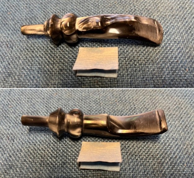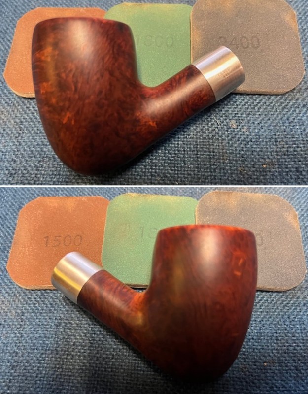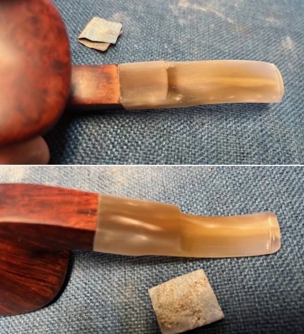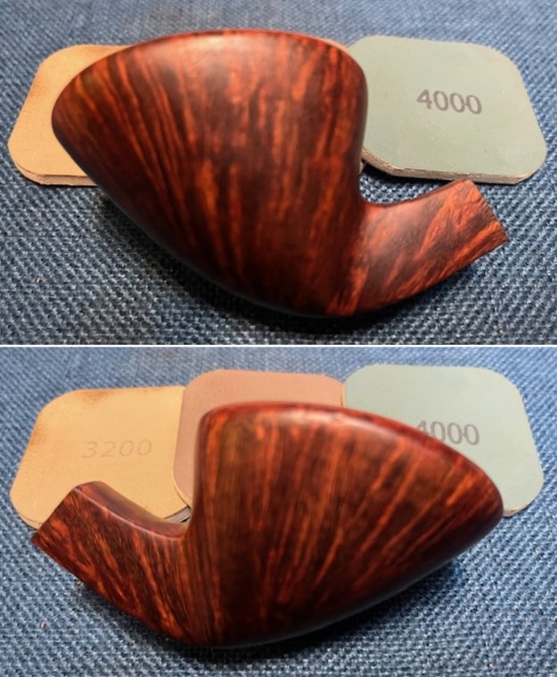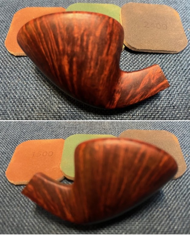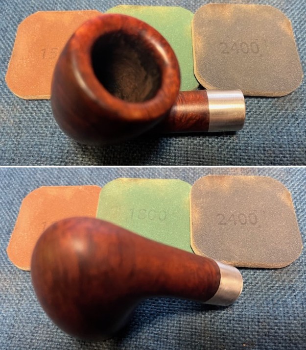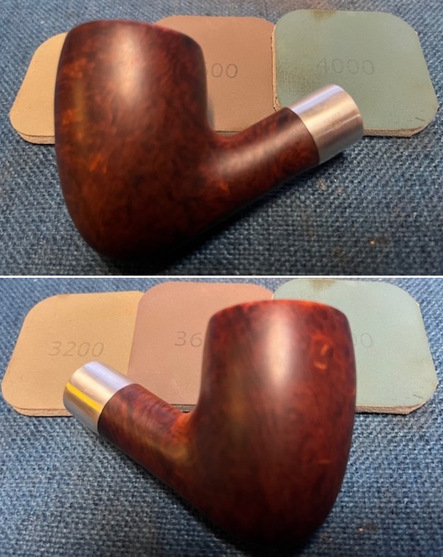 I polished the vulcanite with micromesh sanding pads – 1500-12000 grit pads. I wiped it down with Obsidian Oil after each sanding pad. I used Before & After Pipe Polish – both Fine and Extra Fine to further polish the stem.