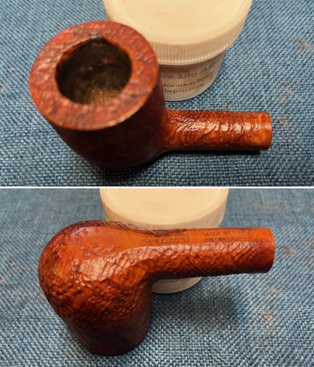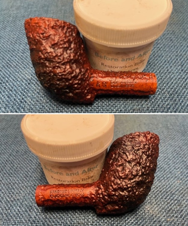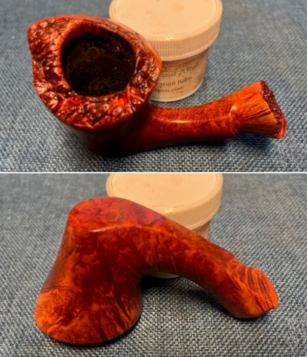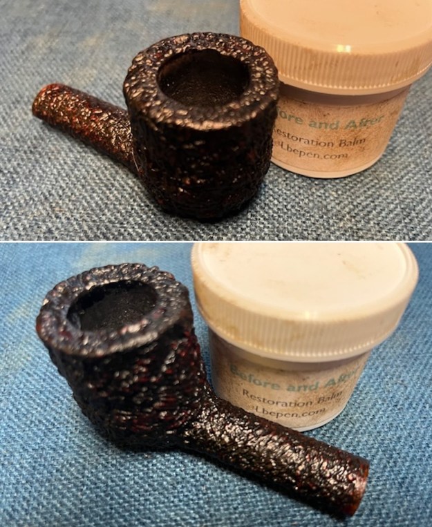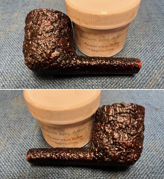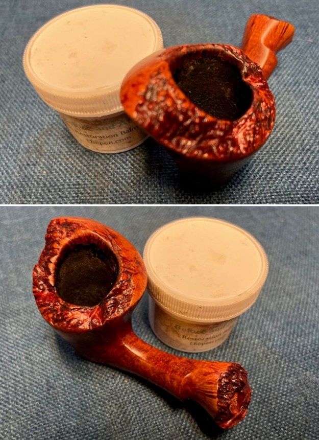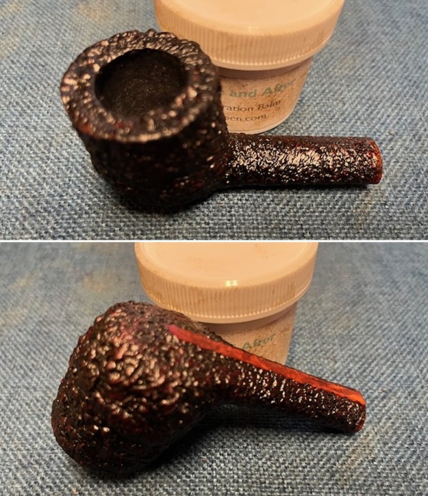 I rubbed the briar down with Before & After Restoration Balm. I worked it into the briar with my fingertips and a horsehair shoe brush to work it into the nooks and crannies of the sandblast finish. The product works to clean, enliven and preserve the briar. I let it sit for 10 minutes then I buffed it with a cotton cloth to deepen the shine. The briar really comes alive with the balm.