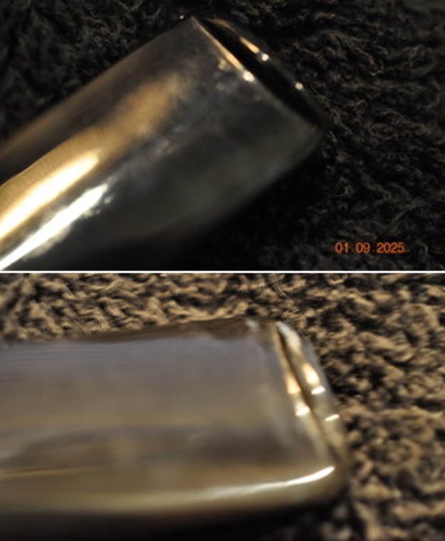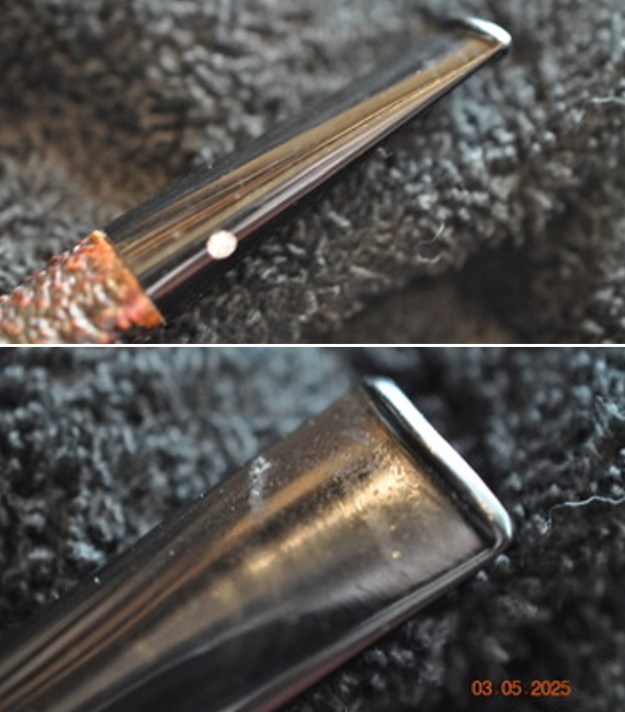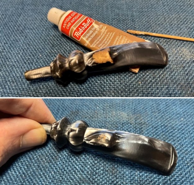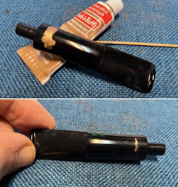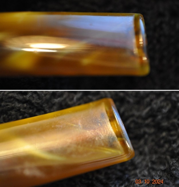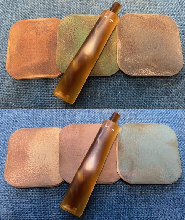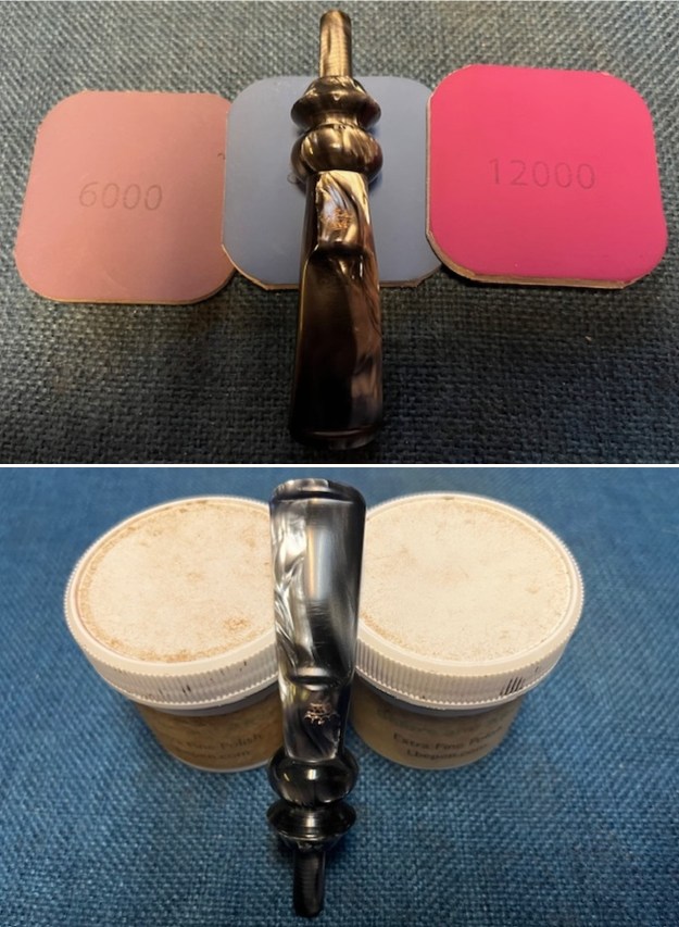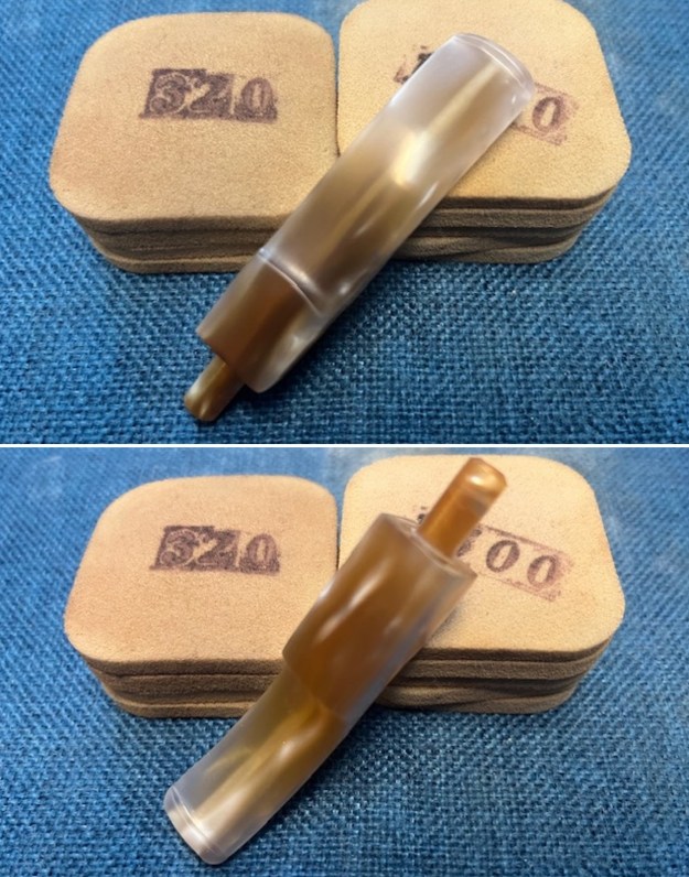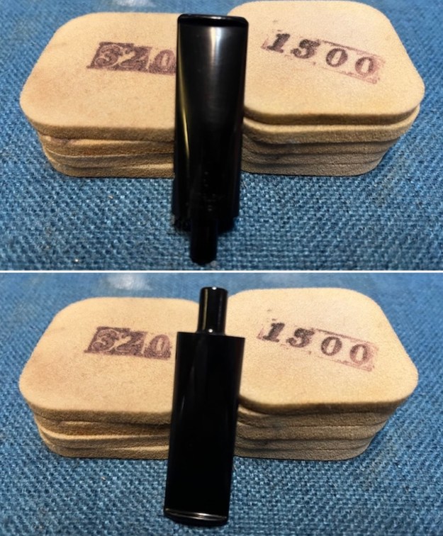 I sanded the stem and tenon surface with 320-3500 grit 2×2 inch pads. I wiped the stem down with an Obsidian Oil cloth after each sanding pad.