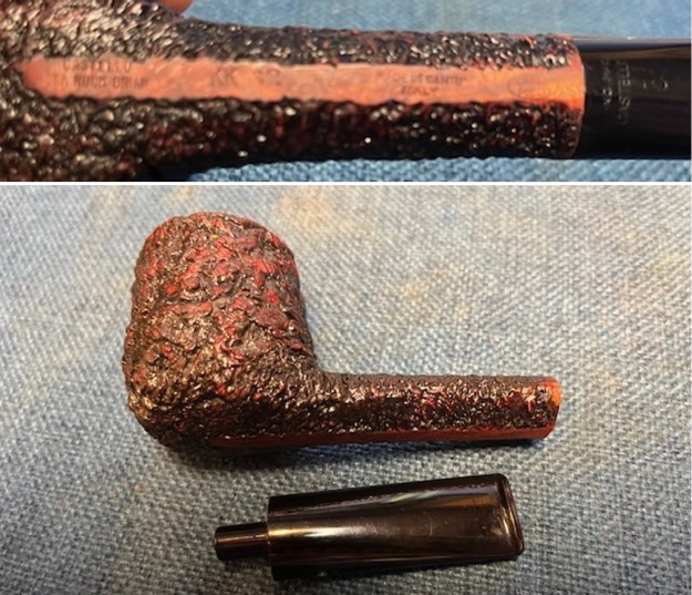 The next pipe on the table is another one that came to us from the seller in Caldwell, Idaho, USA on 07/12/2025. It is a Castello Rusticated Canadian with an acrylic taper stem with the faux diamond on the left side of the stem. It is in dirty but in good condition as can be seen in the photos below. It is stamped on a smooth panel on the underside of the shank and reads Castello [over] Old Antiquari [followed by] KK 32 [followed by] Hand Made [followed by] Made in Cantu [over] Italy [followed by] Carlo arched over Scotti in an oval. The stamping is clear and readable. The pipe has rich Tan and Brown stains on a deep rusticated finish and a dark stain flume around the rim top and down the bowl sides about ¼ inch. The finish was dusty and lightly dirty with grime in the nooks and crannies of the rugged, deep sandblast. The bowl had a moderate cake and there was tobacco debris in the bowl. The rim top had a thick lava coat in the sandblast rim top and edges. The original taper stem is dirty and oxidized. It has the crumpled diamond look to the logo. I took photos of the pipe before I started working on it.