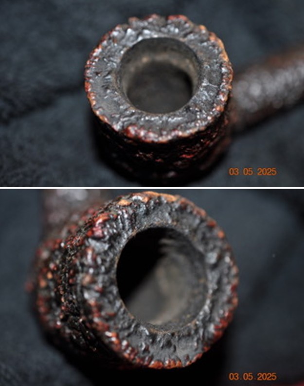 I took photos of the bowl and rim top to show the thickness of the cake and the lava coat on the rim top. There was some tobacco debris in the bottom of the bowl. The stem photos show the condition of the taper stem ahead of the button.