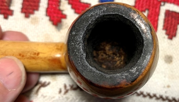 The rim has a heavy cake of lava flow covering it and the chamber is also showing a moderately thick cake. I’ll clean the carbon cake to liberate the Meerschaum underneath. Meerschaum pipes need no cake protection as do briar pipes. This is one of the reasons Meerschaum pipes are unique – one can put them into service repeatedly without resting the pipe. Lock, load, and go again!