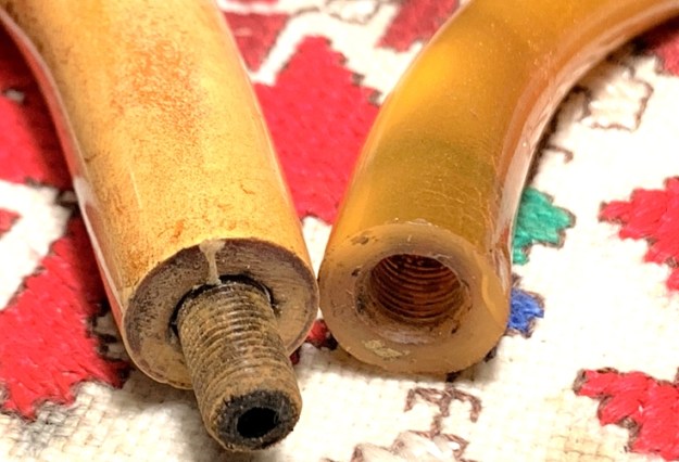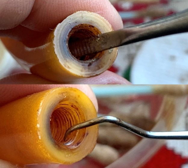I also use the small dental spoon to reach in to the cavity to scrape the dark grunge wedged in the transition from the mortise and airway. It took some time, but using a sharp dental probe, I run the point methodically through the threads of the mortise to dislodge the old buildup. After some time of cleaning, The internals of the amber stem were looking good.