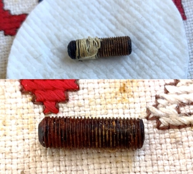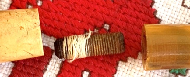 The norm also during this period was that the tenons or connectors of the stummel and stem were made of bone, not acrylic or plastics. I unscrew the stem and examine the threaded connector. I see that the threaded part of the connector screwed into the mortise is thread tightened. After unscrewing the connector from the mortise I take a picture of the connector and the thread used to help tighten the fitting. From initial appearance, my thought was that it is plastic or a hard rubber, but the texture is rougher. I’ll clean it and see what I can determine!