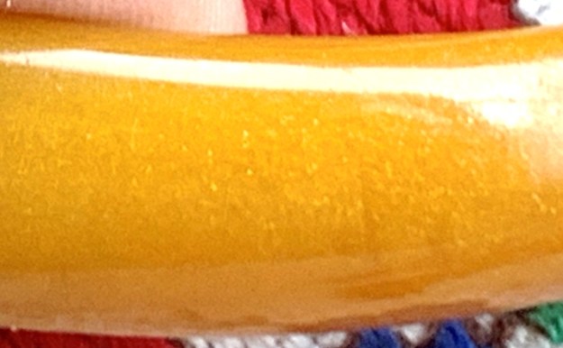 The next test I tried was a ‘make-shift’ semichrome test (see table on left from Jewelry Magazine). I used the silver polish that we have on hand which was the closest thing we have on hand. With a degree of uncertainty as to whether the liquid I was using would do the trick, I put some silver polish on a cotton pad and rubbed a small portion on the underside next to the stem facing – not wanting to try this test in a more visible place. If the material is Bakelite, yellow should come off on the cotton pad as some of the resin is drawn from the surface. My results were negative – no yellow hue was showing up on the cotton pad. Conclusion, maybe, not Bakelite – the test was a bit unreliable.