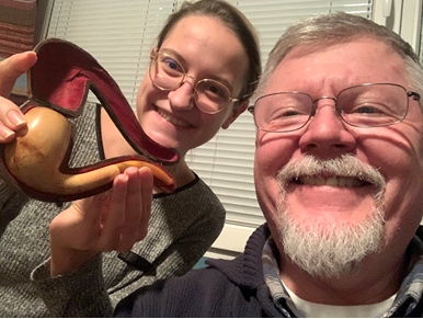 Later, when the pipe unexpectedly arrived at my home with El, I thought CC wanted me to take a closer look to help value it. However, El corrected me making sure I understood that her mom and dad wanted it to be mine. Oh my…. My task now is renewing this treasured Swan Neck Meerschaum, a gift from treasured friends. Realization that it was intended as a gift for me immediately resulted in doing a smiling selfie with El and Swan Neck Meerschaum on display and sending it to Svetly and CC with many thanks!