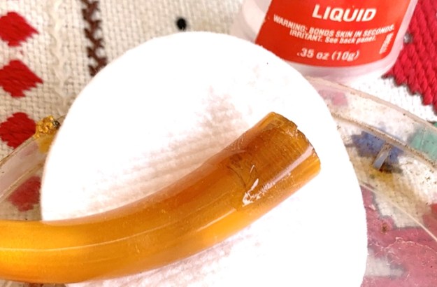 I use extra thick CA glue to attach the main piece. I follow with regular CA glue to fill the shatter point gap. After applying the glue and reattaching the pieces, I set the stem aside for the glue to cure thoroughly.
