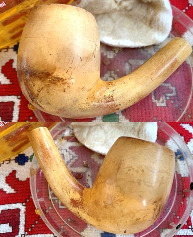 Next to clean the external surface, undiluted Murphy’s Oil Soap works well. Using a cotton pad, I scrub the external Meer surface. The soap will not remove patina. This is a unique surface for a Meerschaum. It’s not like anything I’ve seen before.