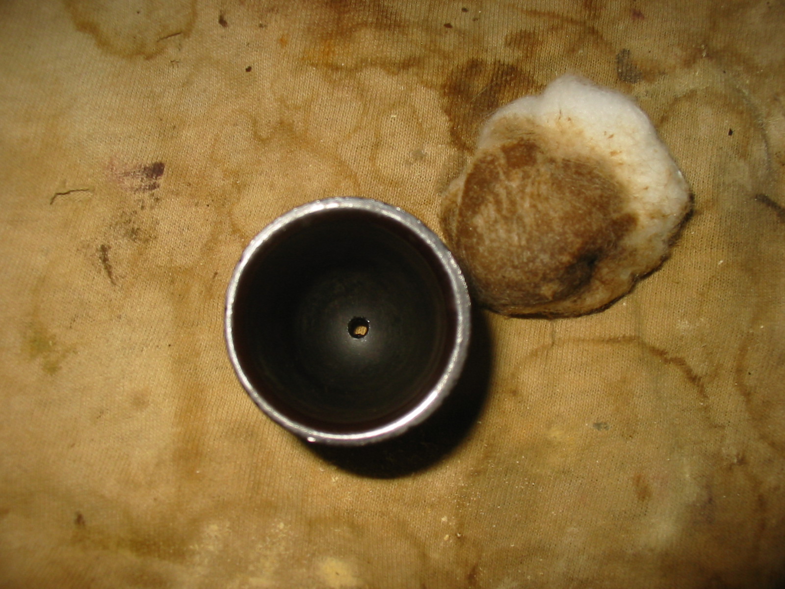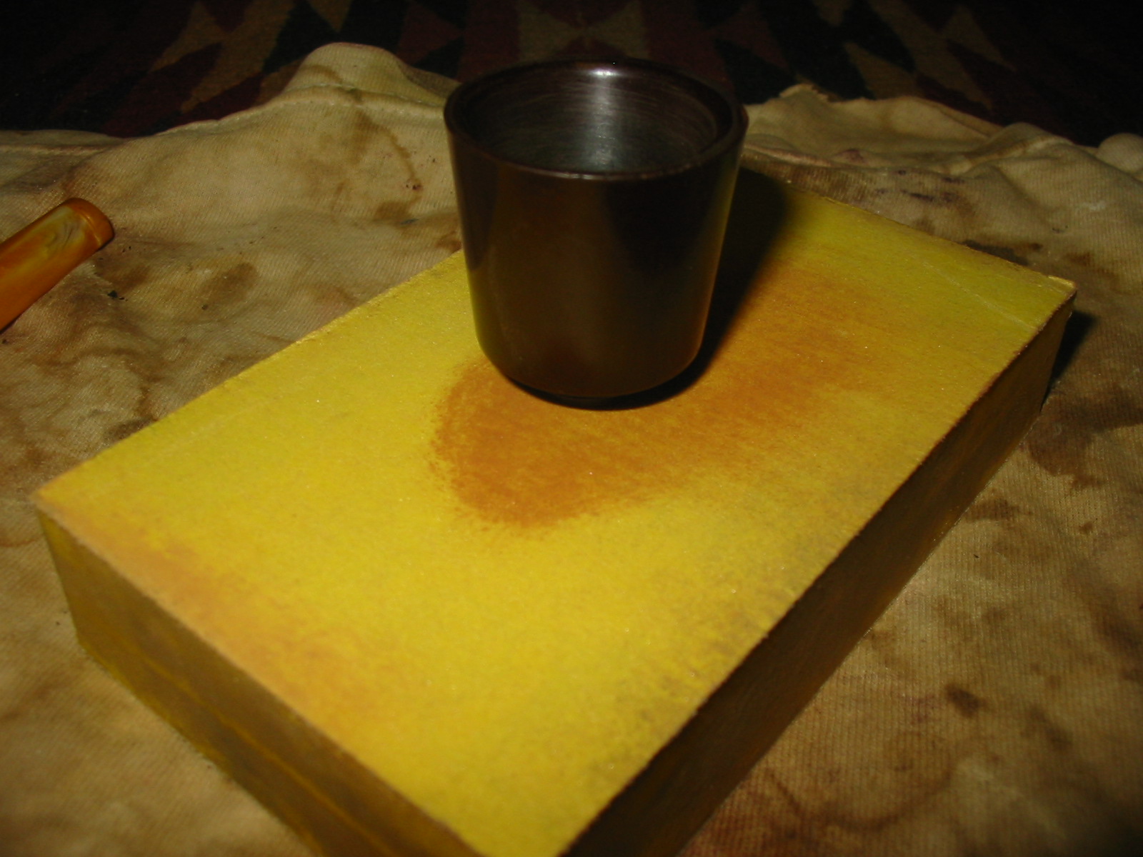 The darkening on the rim top and the outside of the bull cap would need to be dealt with. I cleaned up the inner edge with a piece of sandpaper. I sanded the top of the rim and the sides of the cap with the piece of 220 grit sandpaper and was able to remove much of the darkening.