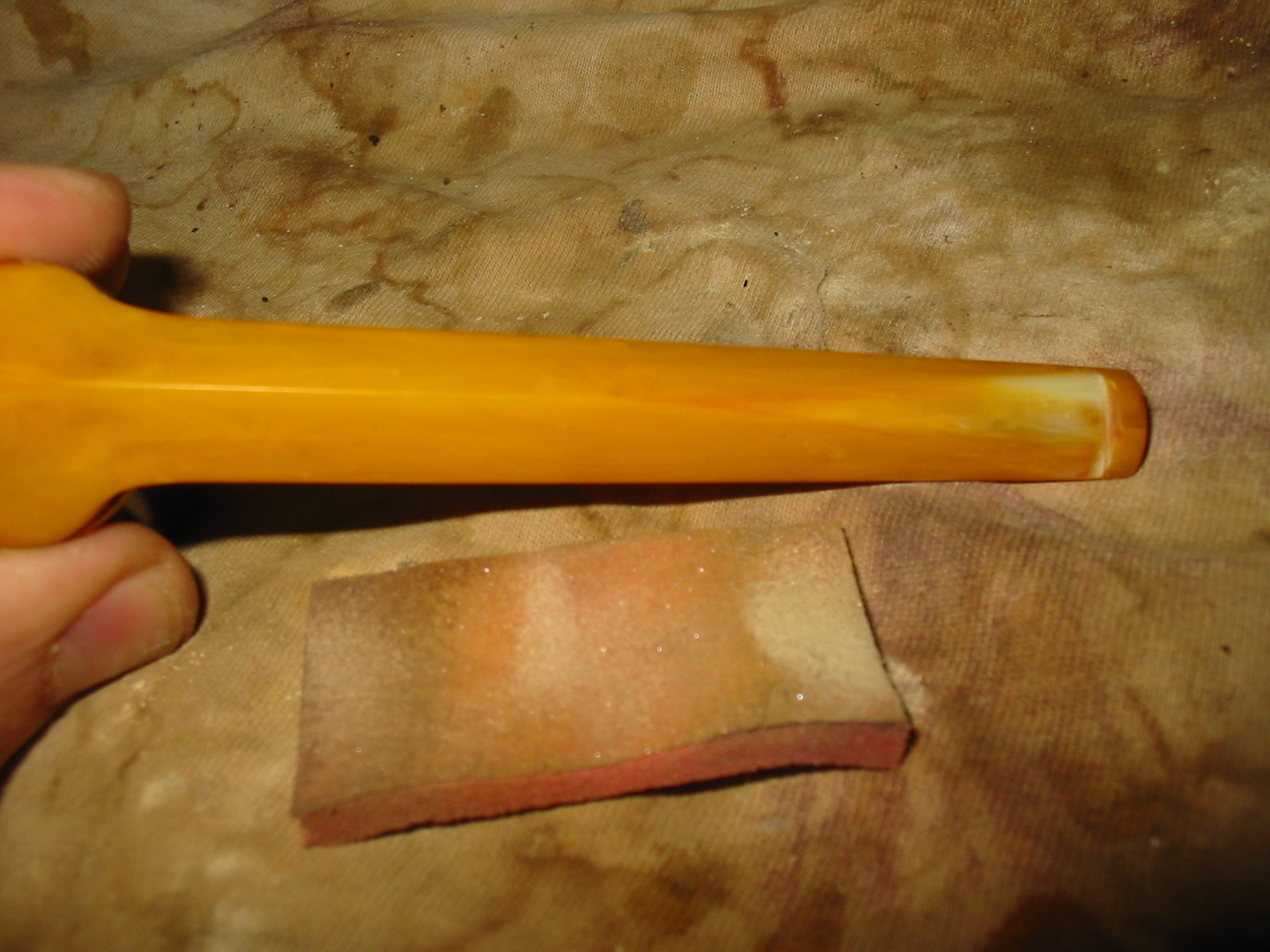 I turned my attention to the stem. I filled in the deep tooth marks in the Bakelite with clear CA glue. After it cured I flattened the repairs with a small flat file. I sanded the repairs further to flatten out the tooth chatter with a folded piece of 220 grit sandpaper. Progress was happening!