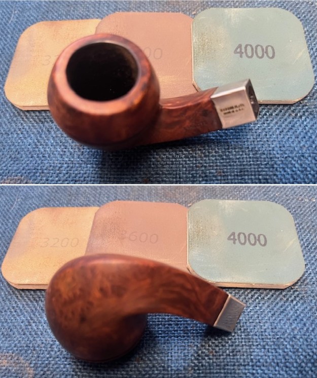 I finished that and moved on to it with 320-3500 grit sanding pads to finish minimizing the burn damage and reshape the rim top and the top half of the bowl. The briar began to take on a rich shine and the burn damage was by and large gone. The photos tell the story.
