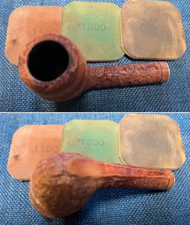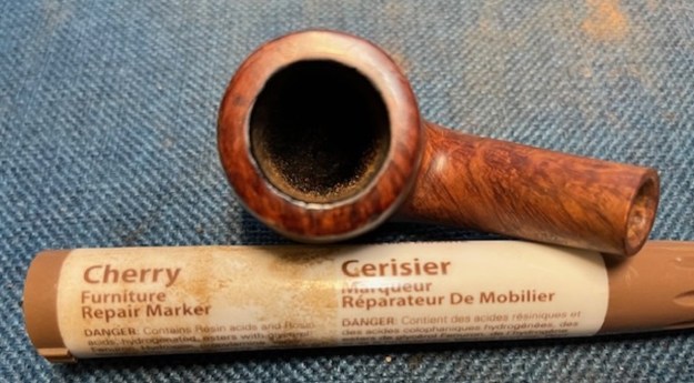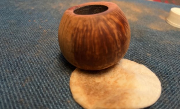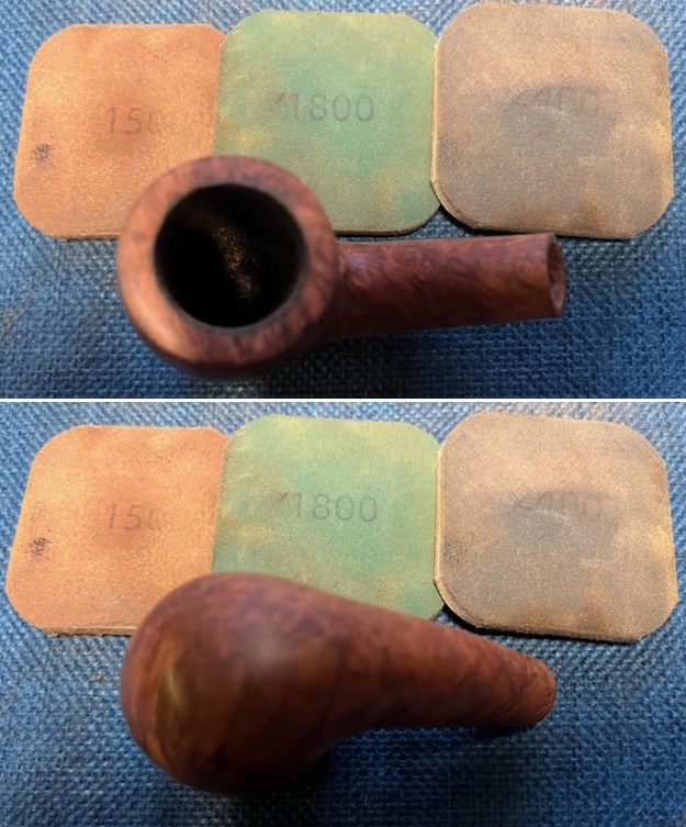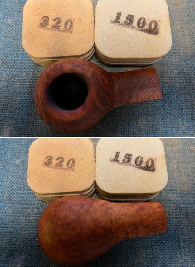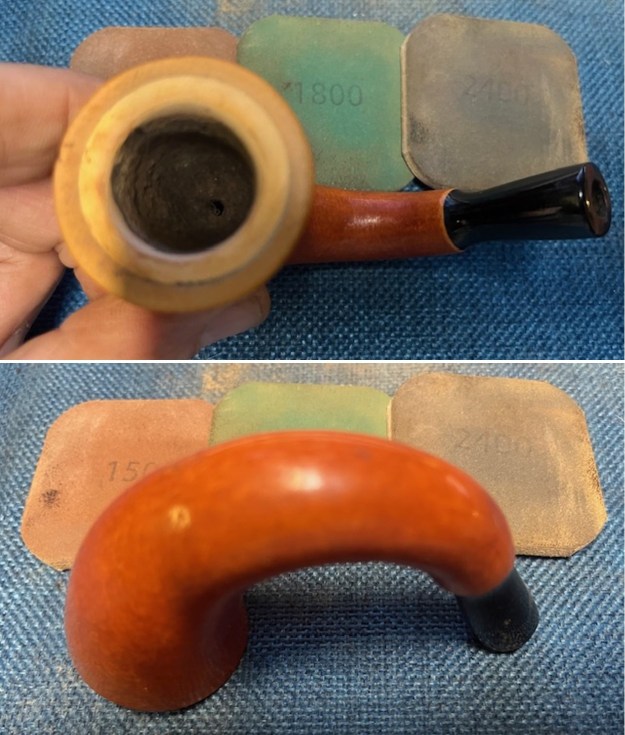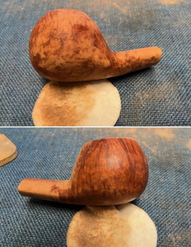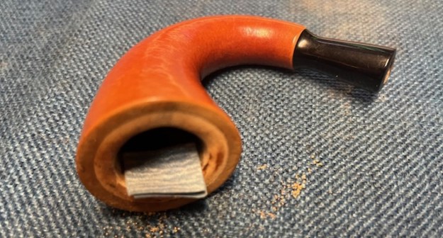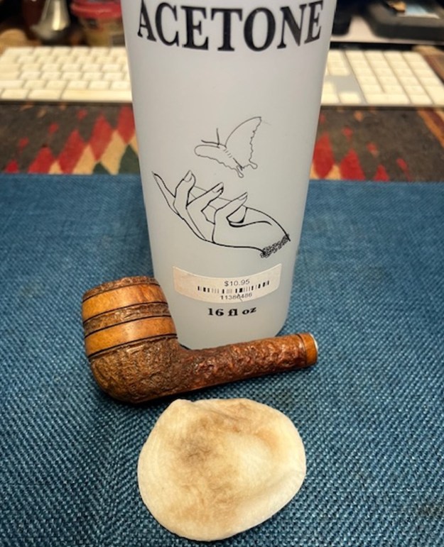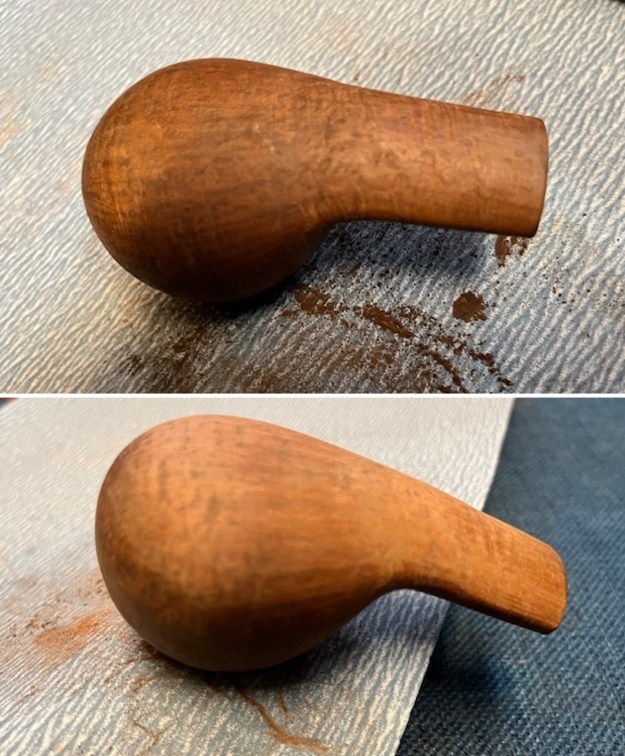 I reamed it with the KleenReem, and 220-grit sandpaper taped to a dowel to eliminate as much build-up as possible. I took the chamber down to bare briar to ensure there were no hidden flaws in the wall. Fortunately, there were none. Then I used cotton rounds and some oil soap to scrub the outside. However, this wasn’t good enough. There were some odd blemishes to the wood and I had to fix that. I went back to the acetone and removed the blemishes thoroughly. I was amazed at how much better the bowl looked after that.