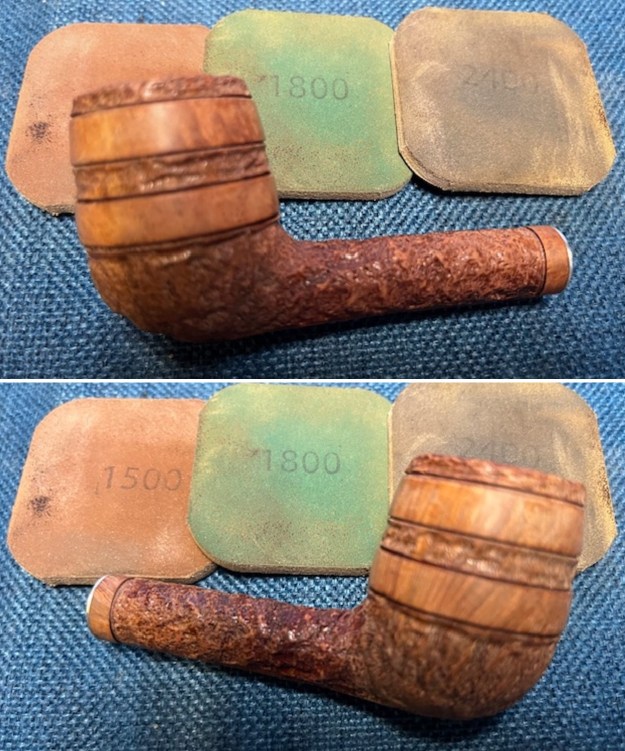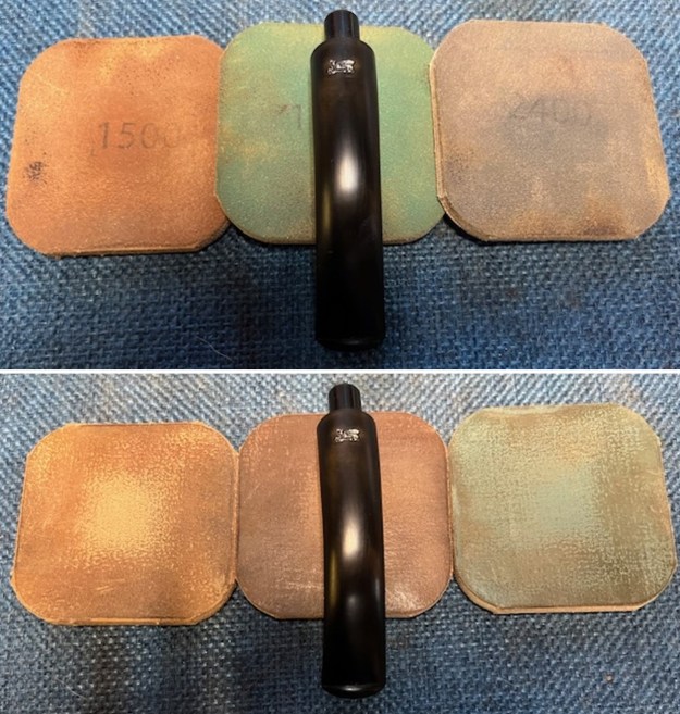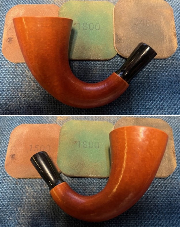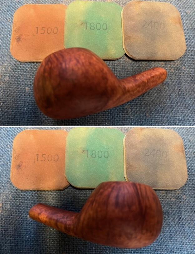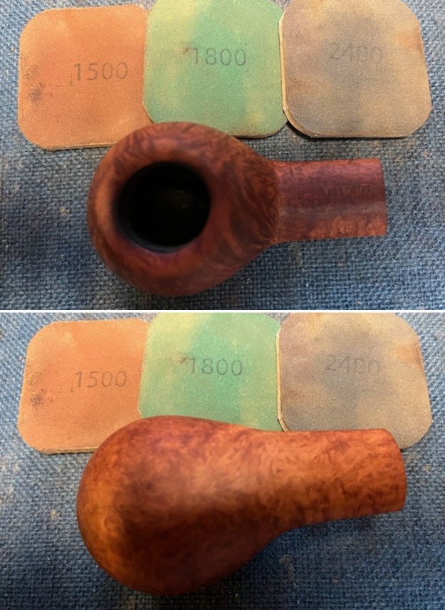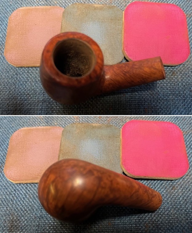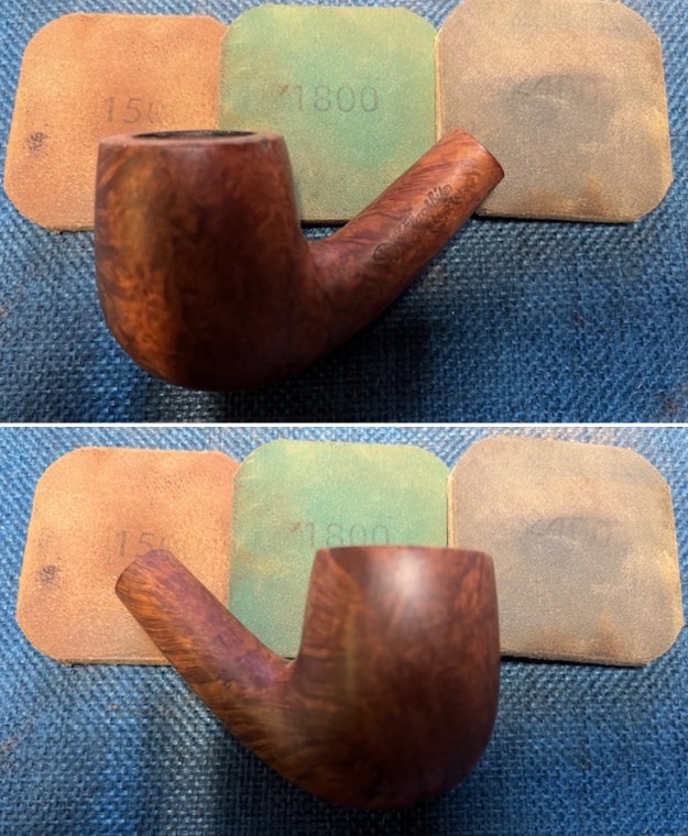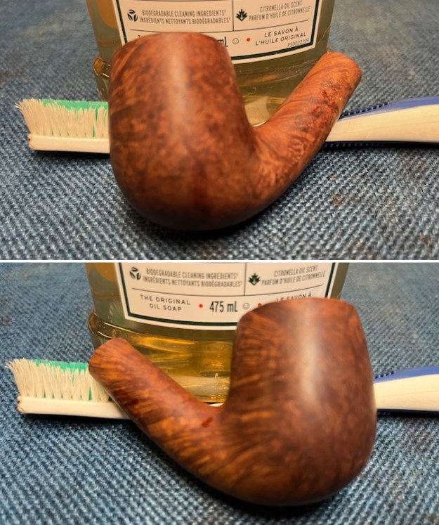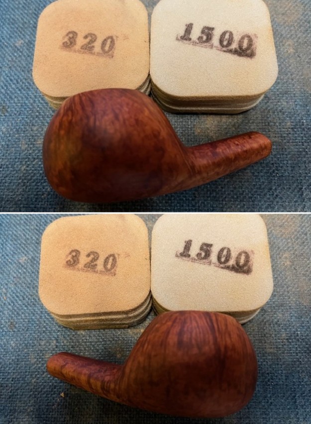 I reamed it with the KleenReem, and 220-grit sandpaper taped to a dowel to eliminate as much build-up as possible. I took the chamber down to bare briar to ensure there were no hidden flaws in the wall. Fortunately, there were none. Then I used cotton rounds and some oil soap to scrub the outside. However, this wasn’t good enough. There were some odd blemishes to the wood and I had to fix that. I went back to the acetone and removed the blemishes thoroughly. I was amazed at how much better the bowl looked after that.