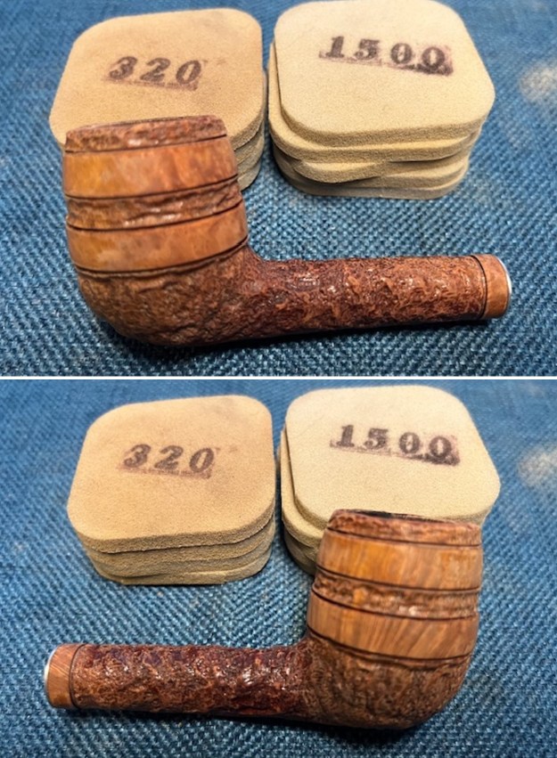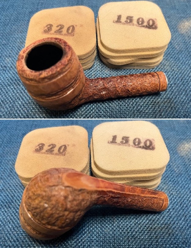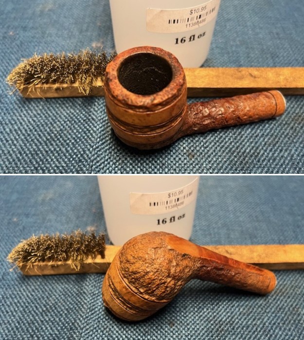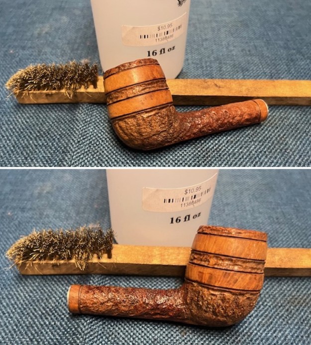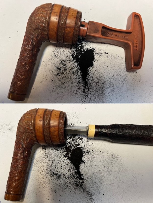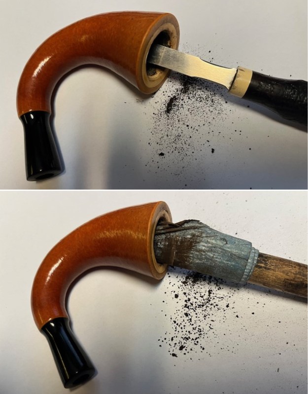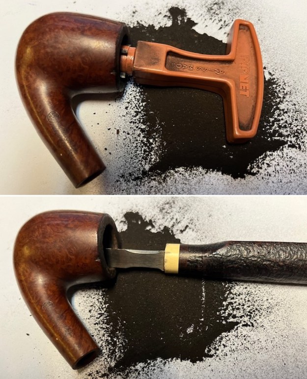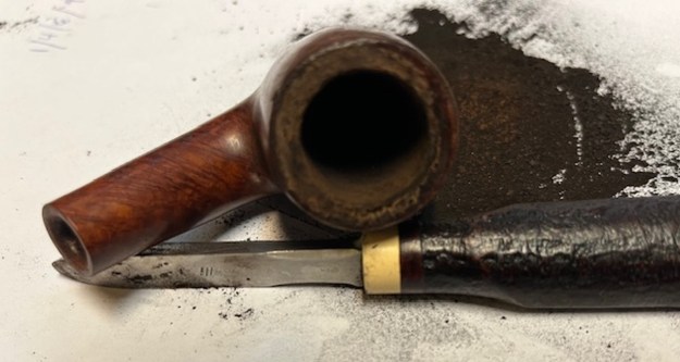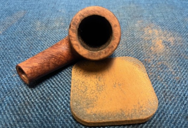 Now for the briar bowl. This is more standard fare, since I’m working with wood again. I took a small wedge of machine metal and, holding it at a 45-degree angle, gently scraped the lava and carbon off the rim.
