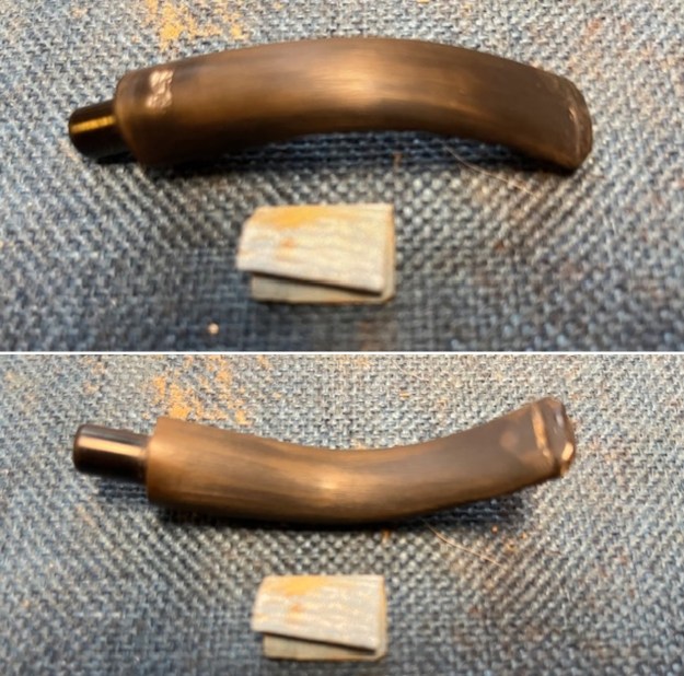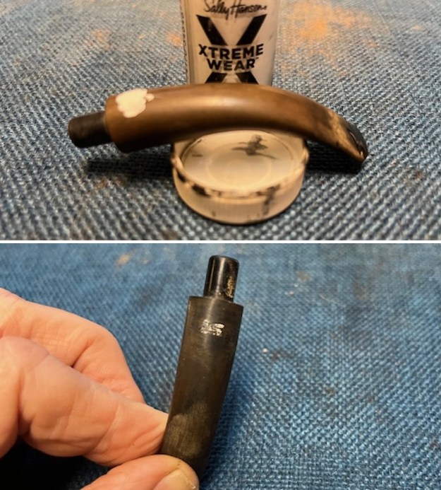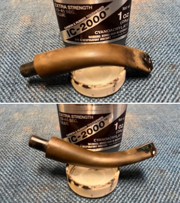 As the photos show, there was a small chunk missing from the end of the stem and, although it didn’t affect anything significant, I wanted to ensure that it was repaired. I rolled up a piece of duct tape and fitted it snugly inside, before making a repair with amber cyanoacrylate adhesive. I used duct tape because the outside does not stick to CA glue.