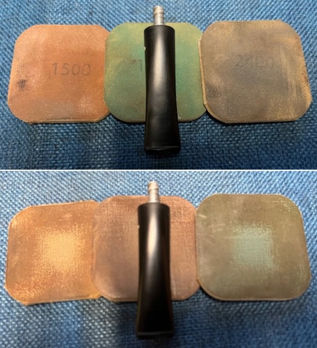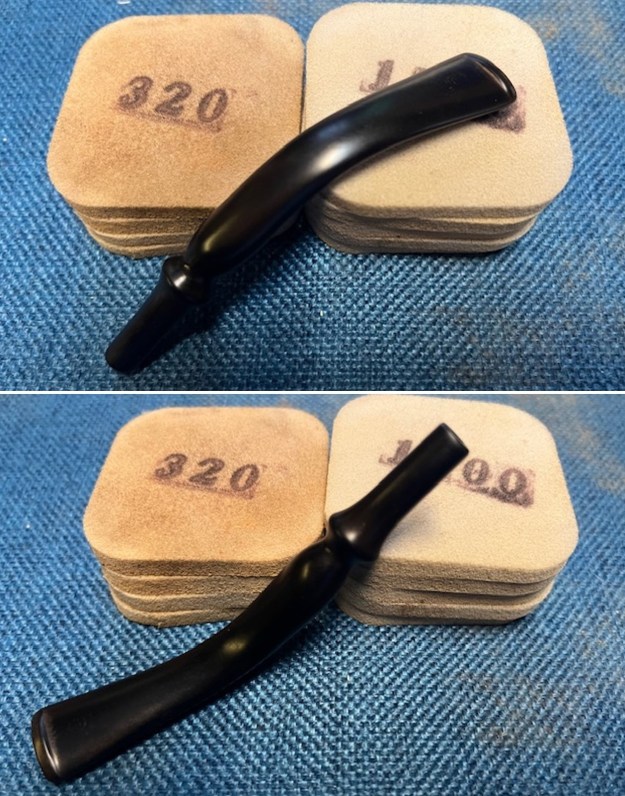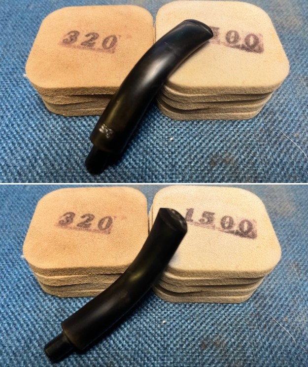 I built up the adhesive on the stem and let it fully cure. At this point, I also added some extra, clear CA glue to the end because the fit was very loose. I then sanded the adhesive with some sandpaper to meld seamlessly into the stem. I then used all nine Micromesh pads (1,500 through 12,000 grit) to smooth the entire stem and highlight the variegated design on the stem. I also used Obsidian Pipe Stem Oil in between each pad scrubbing. I’m not convinced that this did anything, but it’s just what I do!