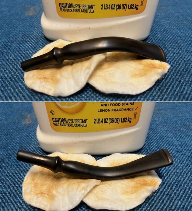 The stem was first on my list. As usual, I wiped the outside down with oil soap on some cotton pads. Then I cleaned out the inside with pipe cleaners and isopropyl alcohol. It was dirty, but not terrible. I’ve seen far worse.