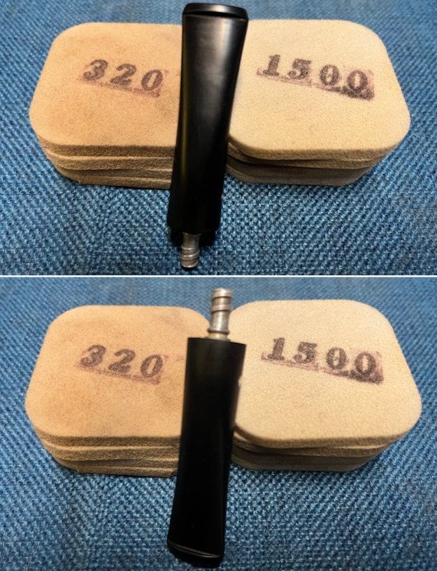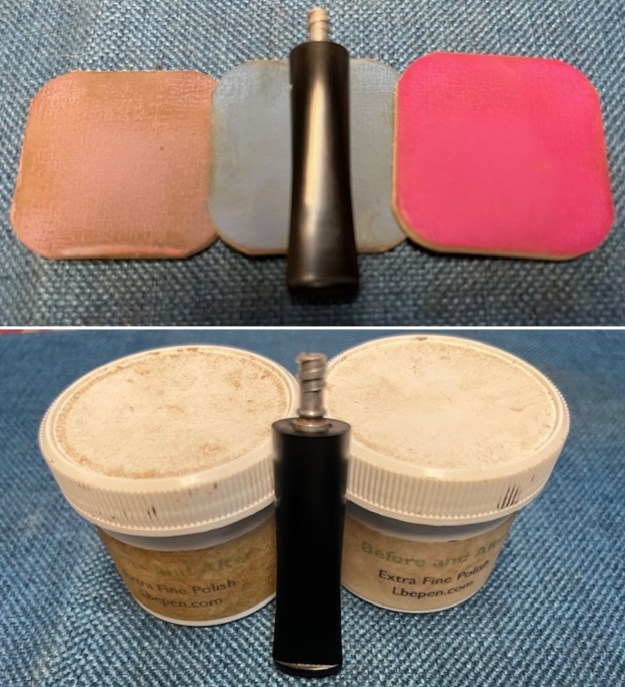 Polishing up the metal was tricky because the cooling fins were relatively deep and would need to be addressed separately. I used some very fine sandpaper to work on those grooves. I then used some 0000 steel wool to give a beautiful polish to the shank. This worked spectacularly well, but it’s such a mess! I laid out some newspaper to catch the debris because it goes everywhere. I did all the same stuff on the two metal screws as well.