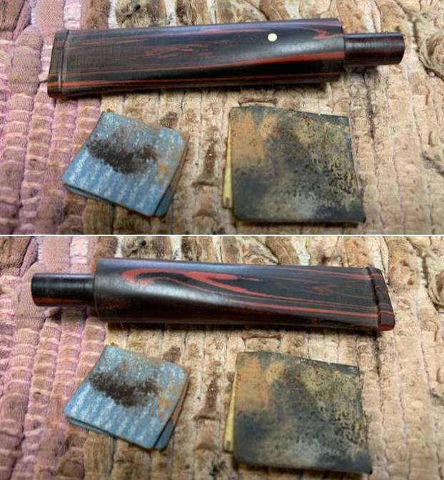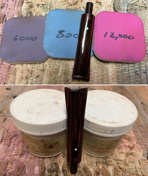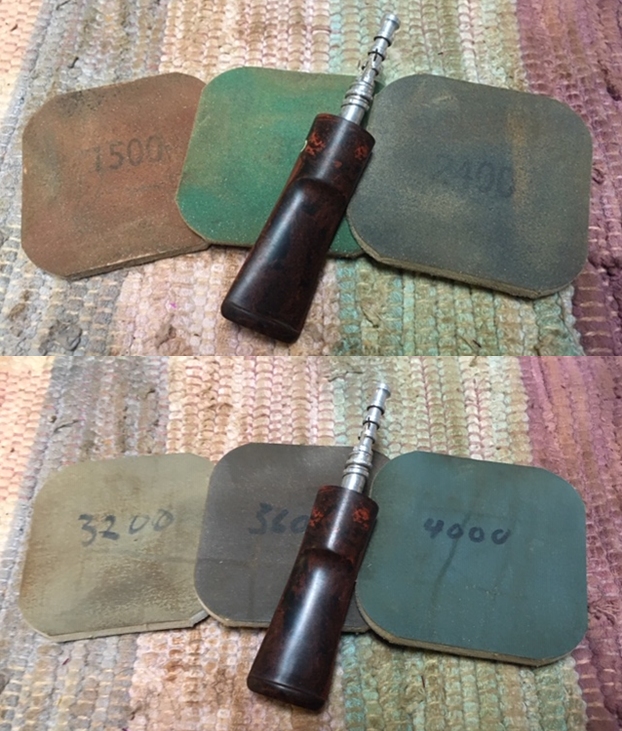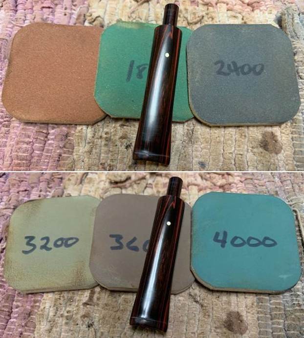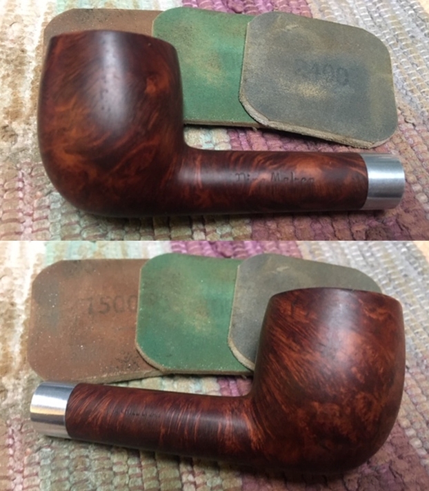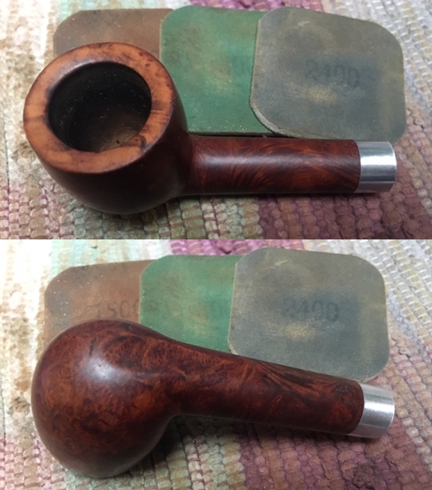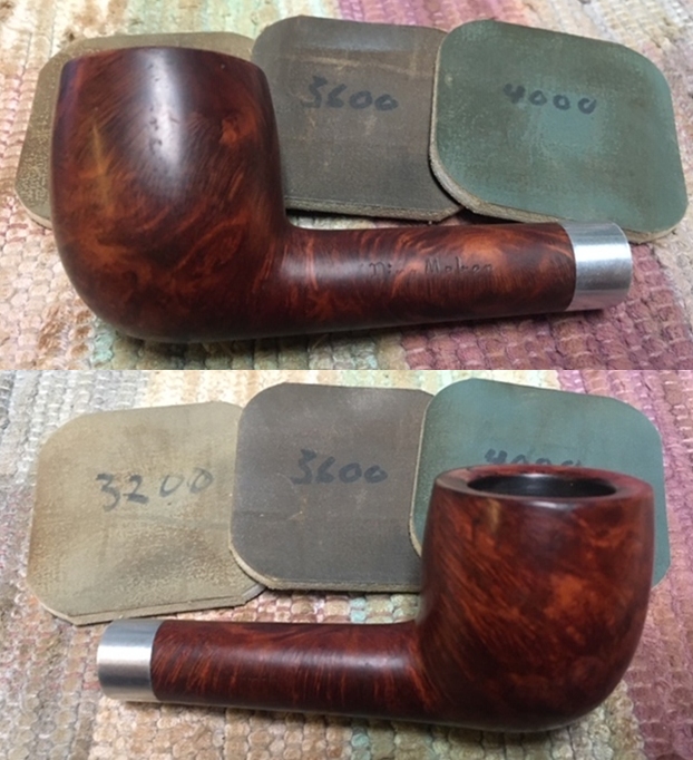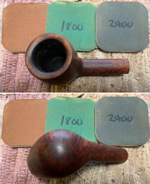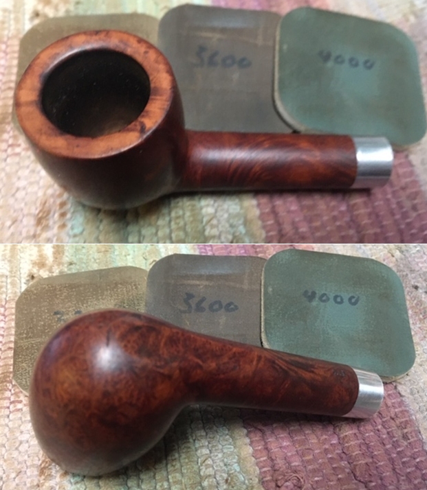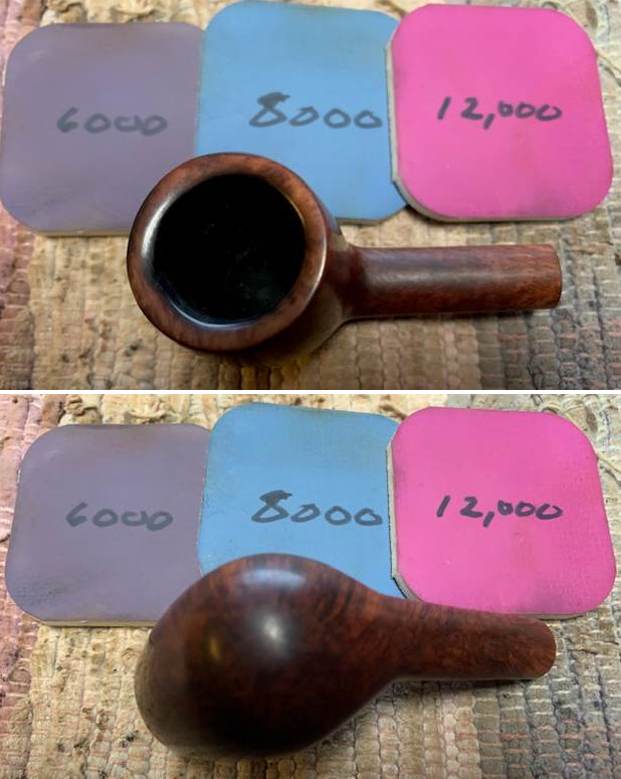 I set the bowl aside and turned my attention to the stem. I sanded out the tooth marks and chatter with 320-3500 grit sanding pads. I wiped it down after each sanding pad with a damp cloth. By the final 3500 grit sanding pad the rim top had a shine.
