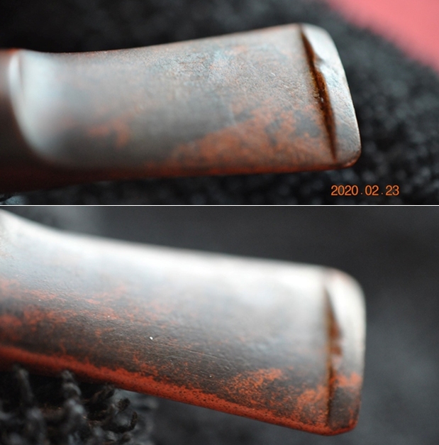 I took some photos of the rim top and stem to show the condition of them both when the pipe arrived. Overall the briar looked good. The Cumberland stem had some light tooth chatter and marks ahead of the button and on the button surface on both sides.