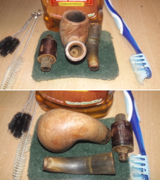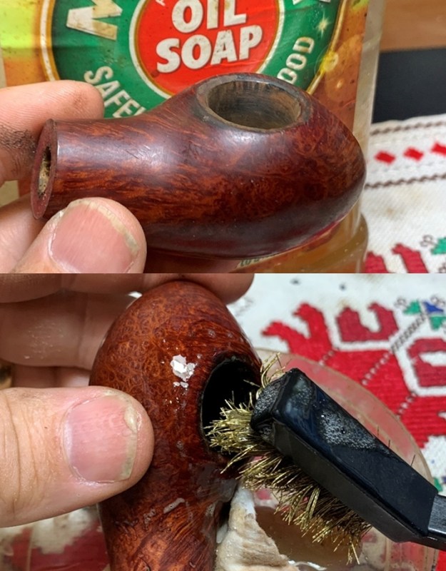 With the chamber cleared of the cake buildup, After taking a starting picture, I clean the external briar surface using undiluted Murphy’s Oil Soap. The stummel is scrubbed with a cotton pad as well as utilizing a brass bristled brush to work on the darkened rim. The brass brush will not negatively impact the briar as it scrubs the rim.