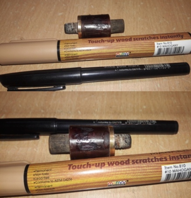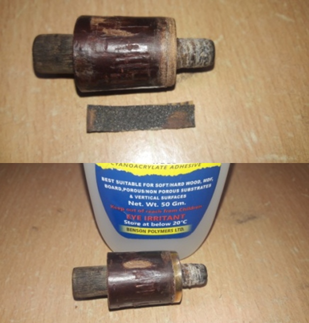 After each coating, I wait until the acrylic is cured before applying another layer. After each cycle, the tenon is carefully fitted into the mortise to determine if another layer is needed. To help it to dry evenly after each application, I ‘post’ the stem vertically on the end of a chop stick. After several coats of clear acrylic nail polish, the fit of the stem was much snugger. Mission accomplished.