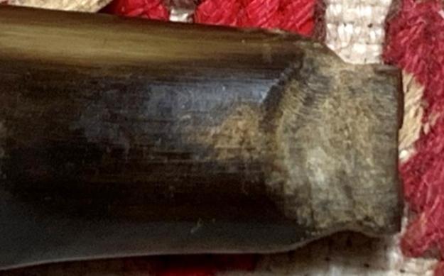 Next, I transition to 240 sanding paper and smooth further the lower bit blending the patch more. Flipping the stem over, the upper bit is sanded to smooth and tighten the horn surface from normal wear.