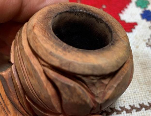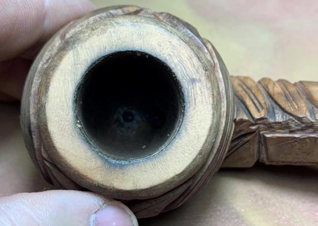The chamber has light cake buildup and will be removed to allow a fresh start for the briar. The rim also shows caking which needs removing so that the condition of the rim can be seen more clearly and to rediscover the rim’s grain. There are nicks and dents around the rise to the rim.