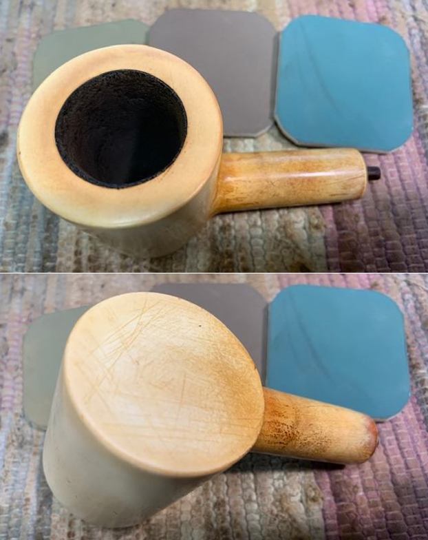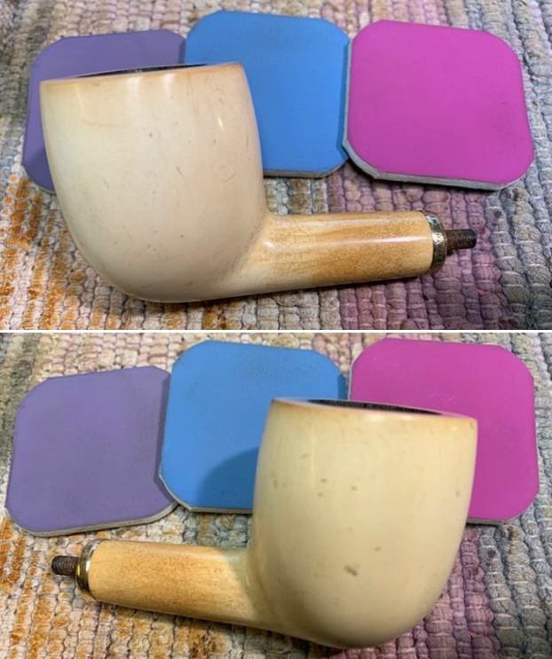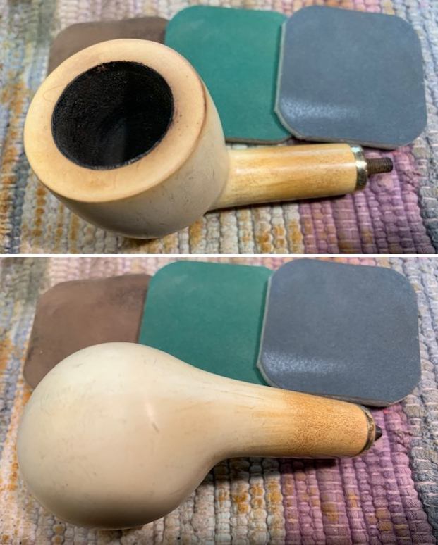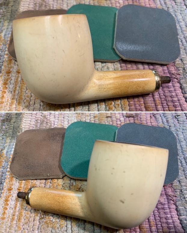 I used micromesh sanding pads to remove the remaining lava coat on the rim top and to polish the light scratching around the bowl. I polished the meerschaum with 1500-12000 grit pads wiping it down after each pad with a damp cloth to remove the debris and dust. The bowl and shank began to really take on a shine as I worked on it. (As I mentioned in the previous blogs, my friend and I spoke on the phone and the decision was made to leave the light scratching as part of the story of the pipe.)