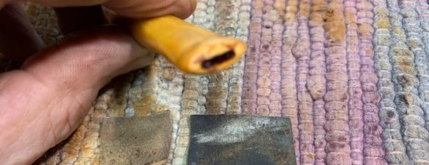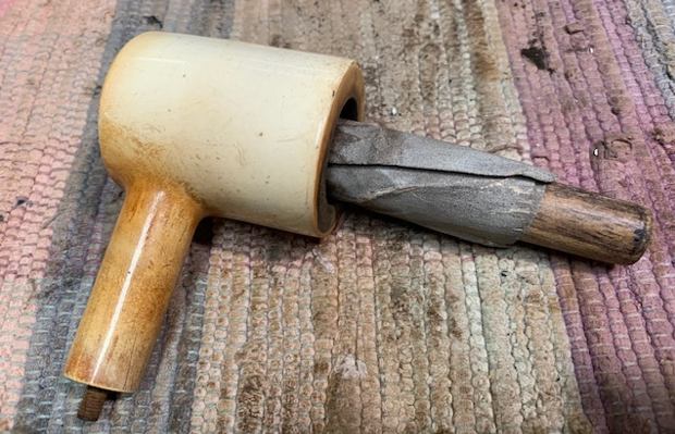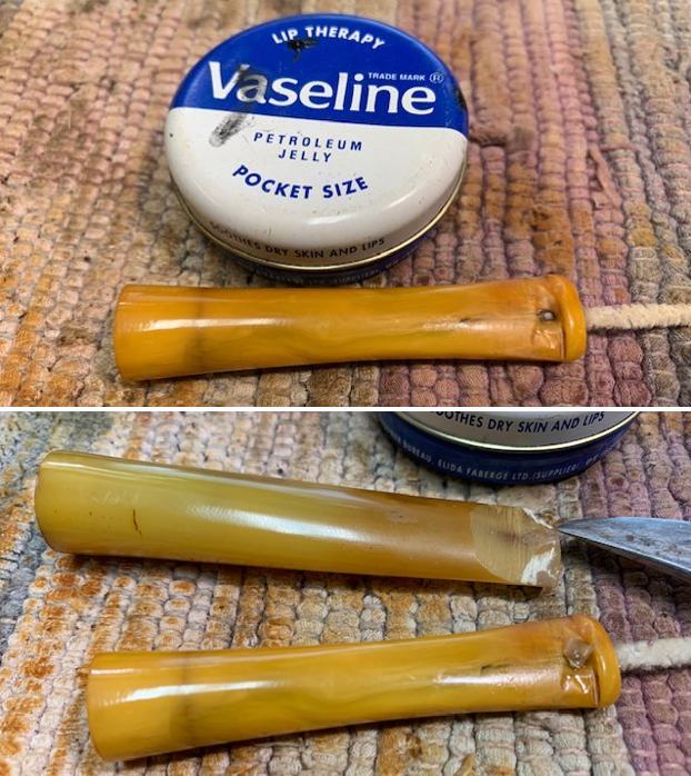 With the stem finished and the bowl completed to this point it was time recoat the bowl with beeswax. I melted a chunk of beeswax in the microwave and brushed the melted wax onto the bowl and shank. I took photos of the thick wax coat around the bowl sides and top. I look forward to seeing what happens when I melt it off!