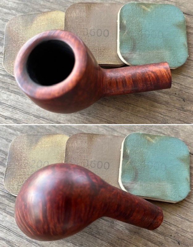 I started my work on the pipe sanding the bowl and rim top with 320-3500 grit sanding pads. I wiped the bowl down after each pad with a damp cloth. The grain is really beginning to stand out.