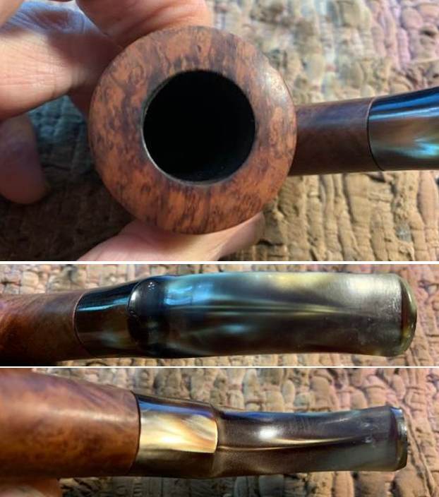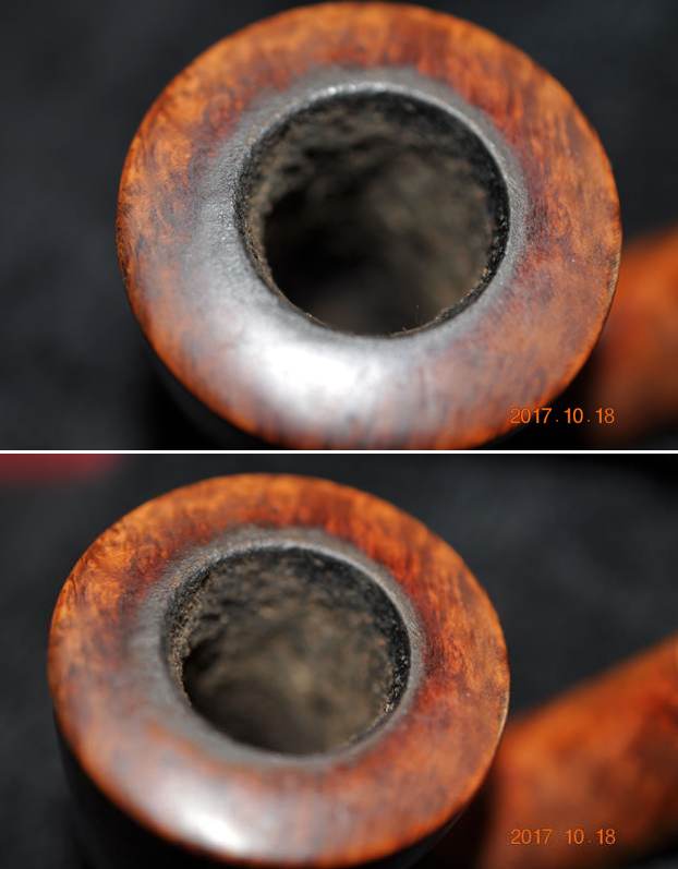 He took some photos of the rim top and bowl from various angles to give me a clear picture of the condition of the rim top and bowl. You can see the cake in the bowl and the thickness of the lava coat on the top and inner edge. He captured the tooth damage on both sides of the stem in the photos.