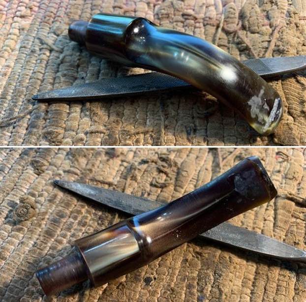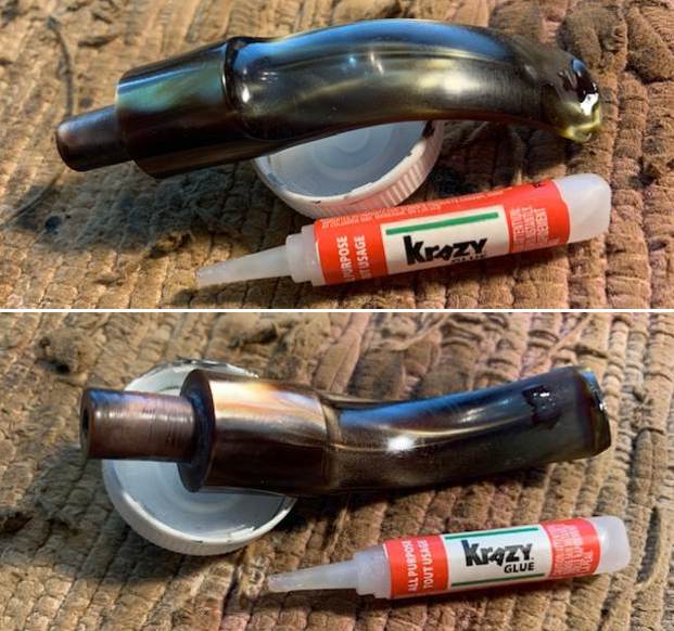 I set the bowl aside and turned my attention to the stem. I filled in the rough bite marks with clear CA glue and set the stem aside to cure. Once it cured I flattened it with a small file and sharpened the edge of the button at the same time.
