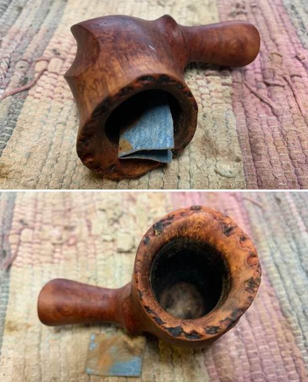 Jeff purchased this pipe on 05/01/2022 at an antique mall in Bozeman, Montana, USA. It is hard smoked freehand with a smooth inward bevel to the rim and a plateau strip left around the outer edge of the bowl. The shank end is tapered at an angle and is smooth. The pipe is stamped on the underside of the shank and reads Wiley[over] Patina [over] U.S.A. [over] 7. The orange/amber acrylic stem has no stamp on it and is a fancy turned piece that appears to me to be a replacement. It will need to be fitted to the shank with more of a taper but it is okay. There was a heavy cake in the bowl and lava overflowing onto the beveled rim top and plateau outer edge. The finish showed some nice grain around the bowl and shank even through the grime that was ground into it. The stem was had some shine that seems to stay with acrylic even when worn. It was dirty and there were tooth marks and chatter on both sides of the stem ahead of the button. Jeff took photos of the pipe before he started his clean up work. He took photos of the rim and bowl to give a sense of what he was dealing with. He also took photos of the stem surfaces to show the condition of the stem when it arrived. The photos of the sides and heel of the bowl show beautiful carving around the bowl and shank sides. There is some were and roughness on the ridges on the heel of the bowl.The brown stain adds depth finish on the pipe. Even under the grime it is a unique piece. He also took photos of the stamped name on the underside of shank. It reads as noted above. I looked on my usual sites for information on the brand. I turned first to Pipephil’s site and did not find a listing for the brand. That is unusual. I then turned to Pipedia to see what was available there (https://pipedia.org/wiki/Wiley). I quote from that article below: