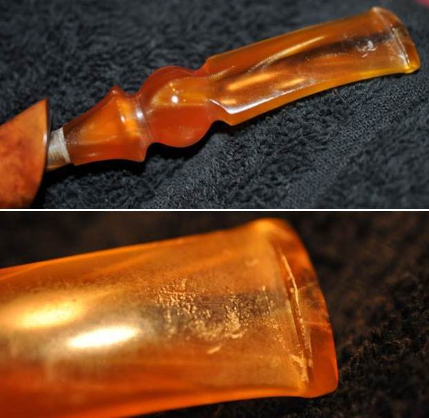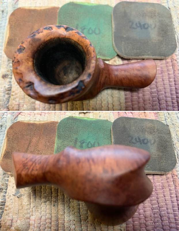 Jeff cleaned up the pipe for me. He reamed the bowl with a PipNet pipe reamer and cleaned it up with a Savinelli Fitsall Pipe Knife. He scrubbed the exterior with Murphy’s Oil Soap and a tooth brush to clean off the grime off the finish and the heavy overflow of lava on the rim top. The cleaning had removed some of the black stain on the rim top. He cleaned up the internals of the shank, mortise and stem with pipe cleaners, cotton swabs and alcohol to remove all of the oils and tars in the pipe. He soaked the stem in Before & After Deoxidizer and was able to remove much of the oxidation. When it arrived here in Vancouver it was a clean pipe and I knew what I had to work with. I took photos of it before I started my part of the restoration. I took photos of the rim top and the stem to show their condition once it arrived in Canada. Jeff was able to clean up the incredibly thick cake and lava overflow that was shown in the rim and bowl photos above. The plateau outer edge and the beveled inner edge of the rim look quite good. He was also able to get rid of the grime and grit in the surface of the briar. There was still some darkening on the rim bevel that I would need to remove. The stem looked better, though there was staining in the airway in the stem. The tenon and the cone shaped end of the stem has some file marks on it and the tenon was not straight. There were tooth marks and chatter on both sides near the button.I have noticed on some repairs that folks don’t pay much attention to the stamping when they are restoring a pipe. To me this is a critical part of the restoration to leave undamaged as it is the only link we have to who made the pipe. I took a photo of the stamping on the underside of the shank to show that it was readable and undamaged by the cleanup work.I removed the stem from the shank and took a photo of the parts to give a sense of what the pipe looks like.I started my work on the inside beveled edge and rim top with a folded piece of 220 grit sandpaper. I was able to remove that darkening on the right front and the back inner edge. It looked much better.I wiped the bowl down with isopropyl alcohol on a cotton pad to remove the dust and debris as well as the spotty stain. I started polishing the briar with micromesh sanding pads. I wet sanded it with 1500-12000 grit pads. I wiped the bowl down after each pad with a damp cloth. The bowl began to take on a rich shine and grain was beginning to stand out. I wet sanded with all of the pads and wiped the bowl down after each pad with a soft cloth. I rubbed the bowl and shank down with Before & After Restoration Balm to deep clean the finish on the bowl and shank. The product works to clean, enliven and protect the briar. I worked it in with my fingers to get it into the briar. I used a horsehair shoe brush to work it into the plateau top.  I let it sit for 10 minutes then I wiped it off and buffed it with a soft cloth. The briar really began to have a rich shine. I took some photos of the bowl at this point to mark the progress in the restoration. It is a beautiful bowl. I set the bowl aside and worked on the stem at this point in the process. I built up the uneven tenon surface with clear CA glue to straighten the tenon out. Once the repair cured I used a small file to flatten the repairs and reshape the tenon. I sanded the repairs with a folded pieces of 220 to remove the marks and the light brown colouration on the stem surface. I sanded them with 600 grit sandpaper until the marks were gone and the oxidation was gone. I polished the stem with micromesh sanding pads – dry sanding with 1500-12000 grit pads. I wiped the stem down after each pad with a damp cloth to remove the sanding dust. I finished by wiping the stem down with a final coat of Obsidian Oil and set it aside to dry. I put the stem back on the Randy Wiley   Patina 7 Freehand pipe and took the pipe to the buffer. I buffed the bowl and stem with Blue Diamond to polish the briar and the acrylic. Blue Diamond does a great job on the smaller scratches that remain in both. I gave the bowl and the stem several coats of carnauba wax and buffed the pipe with a clean buffing pad to raise the shine. I hand buffed it with a microfiber cloth to deepen the shine. The pipe polished up really nicely with a great contrasting stain look to the briar. The finished pipe is shown in the photos below. This is a beautiful Randy Wiley Patina Freehand – the fancy turned acrylic stem and plateau rim top and smooth shank end give the pipe a great look. The polished golden acrylic stem looks really good with the rich browns standing out in the grain. The dimensions of the pipe are Length: 6 inches, Height: 2 ¼ inches, Outside diameter of the bowl: 1 ½ inches, Chamber diameter: 1 inch. The weight of the pipe is 1.83 ounces/52 grams. This is another pipe that I will be putting on the rebornpipes online store in the American Pipe Makers and Pipemaking Companies Section shortly, if you are interested in adding it to your collection. Thanks for walking through the restoration with me on this beauty!