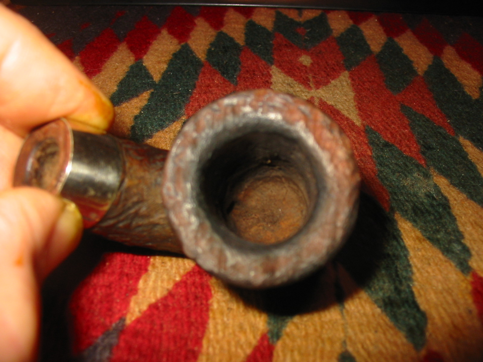 I took the dirty cotton balls out and washed out the bowl and shank with clean isopropyl alcohol and cotton swabs. While it was drying I scrubbed the rim with a brass tire brush to clean off the build up on the rustication. In the photo below the damage to the rustication is very evident. It is burned and worn smooth on the right front and side.