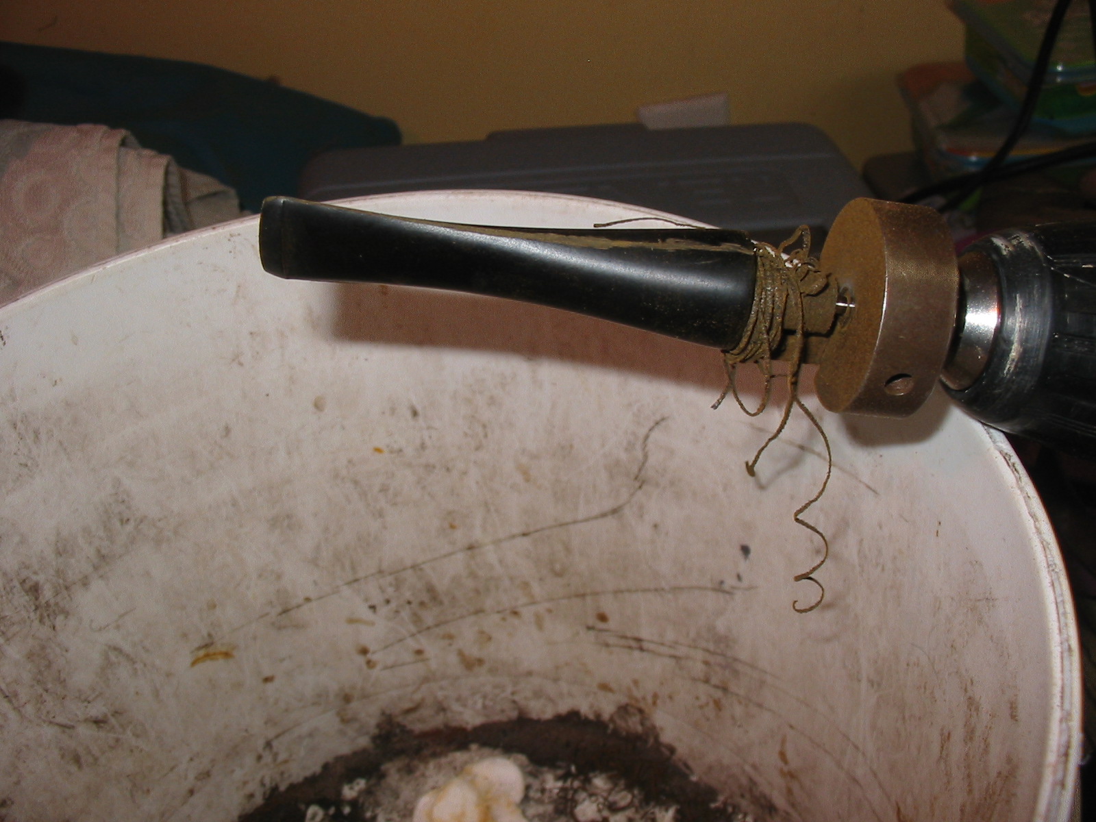 I reamed the bowl with a PipNet reamer until the cake was gone and the bowl was bare wood. My goal was to take back all the cake and rebuild a new smooth one. I pushed a paper clip through the airway to open the clog. I used cotton swabs, shank brushes and a drill bit to remove all of the grime and buildup in the airway and the shank. I scrubbed the exterior of the bowl with a soft bristle tooth brush and Murphy’s Oil Soap. I rinsed it under warm water to remove the soap and patted it dry. Once it was clean I filled the bowl with cotton balls and used an ear syringe to fill the bowl with isopropyl alcohol. I let the bowl sit over night in an ice cube tray to keep it upright. The first photo shows the set up when I first filled it. The second photo below shows the bowl after it had soaked over twelve hours.