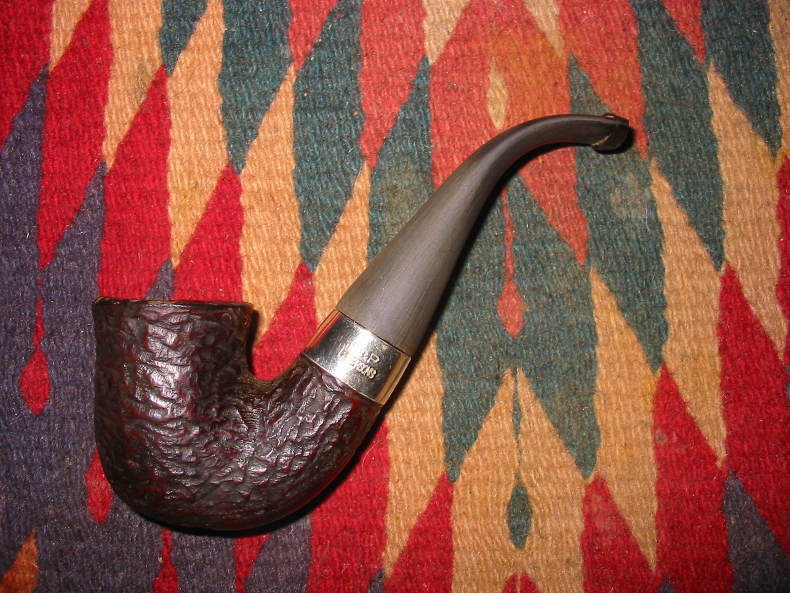 The third pipe in the Peterson trio of pipes shown in the photo below came to the worktable today. It is a Peterson’s Donegal Rocky 05 bent Dublin. It is the second pipe in the photo below. The bowl was badly caked – uneven and broken. The rim had a thick coat of tar and carbon buildup and was damaged on the right front side of the rim. The stem was missing and the nickel band was tarnished but undented. The finish was worn and the grooves of the rustication were filled with grit and grime from years of smoking. Like the other two pipes in this lot it must have been a favourite of the previous owner to be smoked to this degree. The inside of the shank was clogged with thick tars and oils and I was unable to blow air through it.