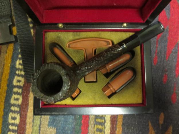 This is the second pipe that was given to me by Chuck Richards. It was a real challenge and it was actually an enjoyable restoration project. This particular pipe is stamped Algerian Briar over Austria on the left side of the shank and on the right side of the bowl below the cap it is stamped EL in an oval. It is actually a nice piece of briar. It is capped by a silver rim cap that goes down the bowl a 1/2 inch. It is rounded over the edges of the rim and flattens in towards the inner rim leaving a briar edge of 1/8 inch. It is topped by a silver wind cap that is hinged a little off centre toward the right side from the back of the bowl. The front of the cap has a folded ornate flap stamped with curls and swirls on the surface. This flap acts as a catch for the lid on the outer lip of the bowl. The cap has a small ball-shaped handle on the top that is for decoration. The cap also has two half circle opening for air. The bowl was heavily caked with a crumbly and soft cake. The stem was horn and was nicely carved. It had also been repaired at least once in its life. At the junction of the smaller part of the stem to the saddle there had been a repair done. It looked at first as if it was copper wire that was used to band the horn which seemed to have splintered and been repaired. Upon closer examination I am almost certain it is a small copper band that was set into the horn stem to secure the break. It is solid. The upper portion of the stem had also splintered and not been repaired. The round end of the button had been worn down on the top and bottom edges to where it was almost squared off. The splinter on the bottom of the stem was loose. The horn was also covered with a shiny lacquer like substance that hid the beauty of the horn. I wonder if it was part of the original repair. The next series of three photos show the pipe as it appeared when I took it out of the shipping box and bubble wrap. I was really interested in seeing what I could do with this one – a worthy challenge that would be enjoyable to work on.