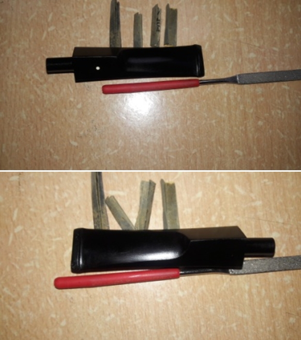I filled in the gouges in the stem surface on both sides by the saddle with black CA rubberized glue. Once it cured I sanded it smooth with 220 grit sandpaper and started polishing it with 600 grit wet dry sandpaper.