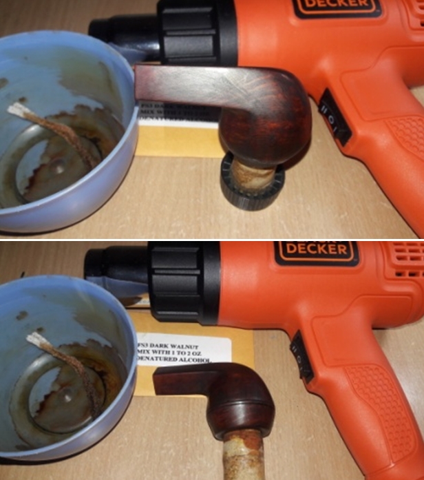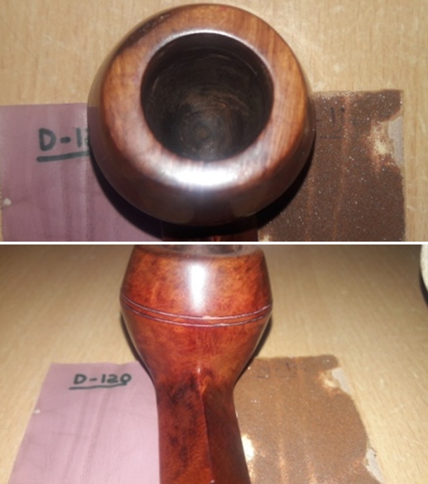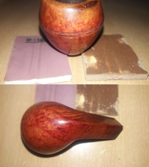 I filled in the damaged back inner edge of the bowl with clear CA glue and briar dust. The edge was damaged but it did not go deeply into the bowl. I sanded out the inside of the edge with a piece of 220 sandpaper wrapped around a dowel. I smoothed out the rim top with a folded piece of 220 grit sandpaper and bevelled the rim a bit more with the sandpaper. I stained the rim top with a Maple Stain Pen to match the smooth portions of the bowl. It was looking good.