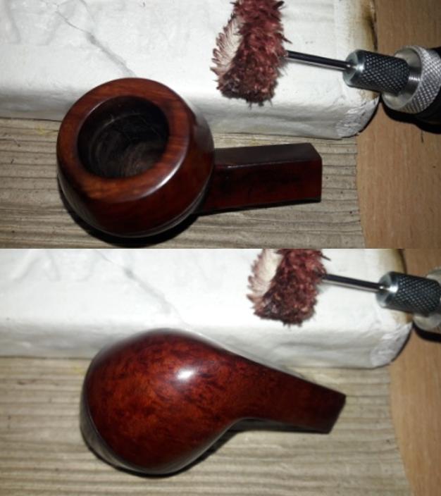 I rubbed the bowl down with Before & After Restoration Balm. I worked it into the finish with my fingertips and a shoe brush. The product works to clean, preserve and protect the briar. I let it sit and absorb for 10 minutes. I buffed it off with a soft cloth and then gave it a rigorous buff to raise the shine. It looks good at this point.