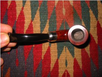 The photo below came from the web and pictures a cutaway picture of the pipe and the unique condensing chamber that makes up the patented portion of the pipe. The shank has an aluminum condensing chamber with a tube in the centre that lines up with the tube inside the stem. It is pointing downward so air swirls around in the chamber formed by the military bit stem and the shank. Moisture is trapped and the smoke is cool and dry without loss of flavour.
