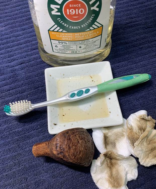 I then proceeded to clean out the insides of the shank with Q-tips, pipe cleaners, and isopropyl alcohol. There was lots of filth inside this stummel, and it took a good number of pipe cleaners etc. to sort that out. I followed that up by cleaning the insides with some dish soap and tube brushes. I then moved on to cleaning the outside of the stummel with Murphy’s Oil Soap and some cotton pads. That removed any latent dirt.