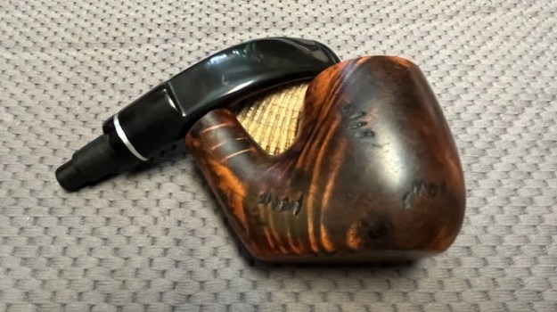 I started my work on the pipe by reaming the bowl. You can see the spotty varnish coat of the finish on the bowl and shank in the photos. I started the reaming with a Pipnet Pipe Reamer using the second and third cutting heads to take back the cake to the bare walls. I cleaned up the reaming with a Savinelli Fitsall Pipe Knife to scrape the remnants. I sanded the bowl walls with 220 grit sandpaper wrapped around a piece of dowel. It looked. much better. I decided to try and remove the spotty varnish coat. I wiped the bowl down with acetone on cotton pads to remove as much as I could. I would need to do some sanding on it as there were still dark spots on the finish that would need to be removed. I went through my bands and found a ferrule style diamond band from the shank end. It was a good fit from the look of it. I heated it with a lighter and pressed it onto the cracked shank. It fit very well and brought the cracks together. It slight covered the “o” on the end of the Angelo stamping. I sanded the top of the bowl with a folded piece of 320 sandpaper to clean up the rim damage and the inner edge. Once it was flattened I used a wooden sphere to further clean up the rim top and to minimize the damage on the inner edge of the bowl. I sanded to remove the darkening around the rim and inner and outer edge of the bowl. It is frustrating, but I forgot to take photos at this point so I posed the bowl after my polishing to show what I had done.I stained the bowl with dark brown aniline stain (Feibings Shoe Dye) and flamed it to set it in the briar. Once the stain cured, I sanded the bowl with sanding pads – 320 -3500 to smooth out the finish and remove all the scratches and excesses. Once again, I forgot to take these photos. I think I am out of the habit of photographing the pipes as I work on them. After sanding the bowl with the 320-3500 grit sanding pads I moved on to polish the briar with 1500-12000 grit sanding pads. I wiped it down with a damp cloth to remove the dust and debris left behind. I rubbed the bowl down with Before & After Restoration Balm and set it aside to let the product do its work. After about 10 minutes I buffed it off with a soft cloth to polish the briar. The pipe bowl and polished band looked very good. I really am rusty after a month of not restoring any pipes. I forgot to clean out the inside of the shank. I used cotton swabs, pipe cleaners – both bristle and fluffy and isopropyl alcohol to work over the inside of the shank. It is much cleaner now that I remembered to do it!I polished the nickel band on the shank with a jeweller’s cloth to give it a shine and protect it from oxidizing. It looked much better with the shine. I set the bowl aside and turned my attention to the new stem I needed to fit on the pipe. The previous stem (origianal??) had many cracks in the saddle portion, the tenon was loose and the whole thing had been wrapped tightly with electrical tape. I went through my stems and found one that would work well wit the bowl. In the photo it looks longer but it is actually about the same length. The tenon will need to be reduced in diameter and the casting marks removed but the stem should look great once it is finished.The next phojto showed the bowl before I had finished it. I started fitting the stem to the shank before I worked on the bowl finish. I used two files to reshape the tenon. I shortened the tenon to match the depth of the shank with the Dremel and sanding drum. Once I had the length correct and the fit of the tenon correct I put it on the shank and took photos of the pipe to show the new look it had with the new stem. It still needed much more work to smooth out the stem surface but it looked good on the shank with the band. I sanded the stem surface with 220 grit sandpaper. I smoothed out the castings on the sides of the stem and the button surface. I sanded the saddle portion and the top and underside of the blade with the 320 sandpaper. It looked better and the fit to the band on the shank end was very good.I sanded the stem further with 320-3500 sanding pads. I worked on the surface of the stem to give it a smooth finish. The finish on the stem was getting smoother with the work.I polished the stem with 1500-12000 grit micromesh sanding pads. It began to take on a rich glow and the surface was very smooth. This reworked and restemmed Angelo Straight Bulldog has a beautiful finish now that the varnish coat has been removed and the bowl restained. It truly has a new lease on life. The medium brown/black finish gives depth to the grain around the bowl and shank. The newly fit polished black vulcanite stem adds to the mix. I put the stem back on the bowl and buffed the pipe with Blue Diamond on the buffing wheel being careful to not buff the stamping. I gave the bowl and the stem multiple coats of carnauba wax on the buffing wheel and followed that by buffing it with a clean buffing pad. I hand buffed the pipe with a microfiber cloth to deepen the shine. The finished Angelo Straight Bulldog is quite nice and feels great in the hand. Give the finished pipe a look in the photos below. The dimensions of the pipe are Length: 6 inches, Height: 1 ¾ inches, Outside diameter of the bowl: 1 ¼ inch, Chamber diameter: ¾ of an inch. The weight of the pipe is 1.66 ounces/49 grams. Thanks for walking through the restoration with me as I worked over another beautiful pipe. The fellow who dropped it off will pick up his pipe on the weekend. I am looking forward to seeing what he thinks of it.